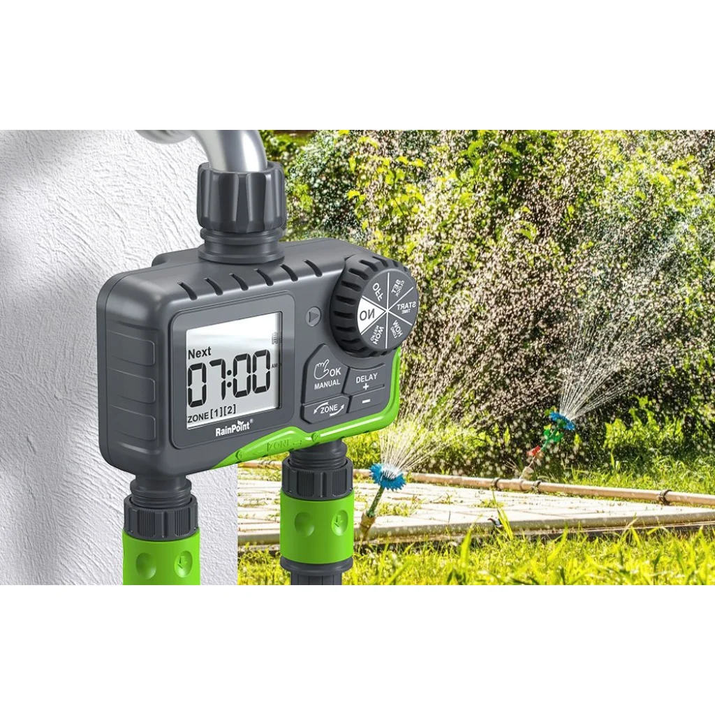 A RainPoint ITV205-DLS 2 zónás öntözésvezérlő lehetővé teszi, hogy kertjének két területét külön-külön programozza. A nagy LCD (folyadékkristályos kijelző) képernyő és az intuitív tárcsa a zónaválasztó funkcióval megkönnyíti az ütemezések beállítását. Mindegyik zónához külön-külön beállítható az öntözés kezdési időpontja, hossza és gyakorisága. A kézi üzemmód és az esőkésleltetett öntözés funkció rugalmasabbá teszi a működést. Az IP65 (nemzetközi védelmi besorolás - por és vízsugár elleni védelem) vízállósági besorolás és a beépített szűrő biztonságos és tartós kültéri használatot biztosít.