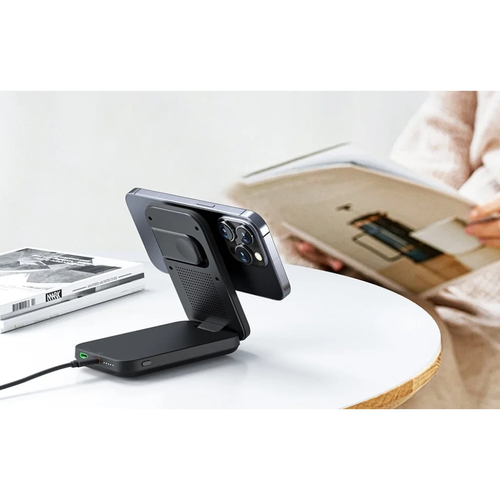 Praktikus kialakítás: A LED-ek folyamatosan jelzik a töltöttségi szintet. A kompakt, összecsukható állvány lehetővé teszi, hogy okostelefonját kényelmesen helyezze el függőlegesen vagy vízszintesen.