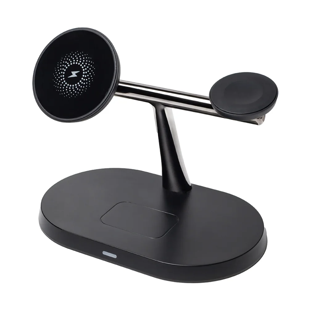 - AirPods töltő (3W): Az állomás talpán található lapos felület ideális az AirPods tokjának vezeték nélküli töltésére, így fülhallgatóid is mindig bevetésre készen állnak.