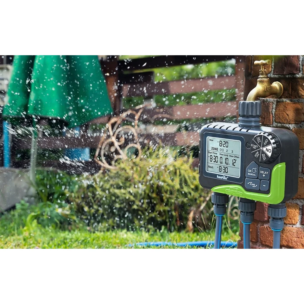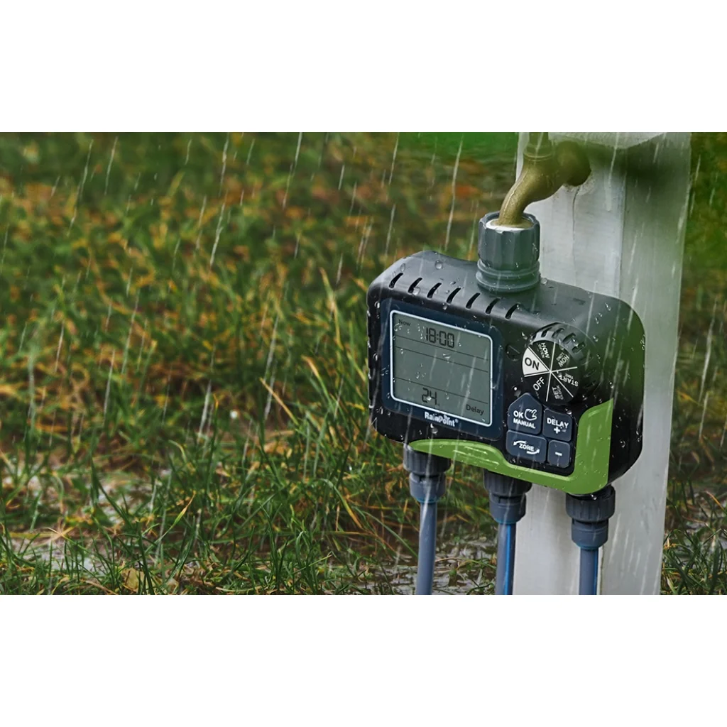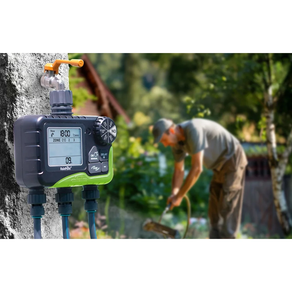 A vezérlő használata rendkívül felhasználóbarát. A nagyméretű, jól olvasható LCD kijelzőn (amely 12H/24H időformátumot is támogat) minden fontos információ azonnal látható: az aktuális idő, a kiválasztott zóna (1, 2 vagy 3), a programozott indítási idő, az öntözés hossza és gyakorisága, valamint a következő öntözés időpontja. A nagyméretű funkciótárcsa és az ergonomikus gombok (mint például az "OK/MANUAL" és a "DELAY" gombok) segítségével a programozás és a zónák közötti váltás pillanatok alatt elvégezhető. Az egyszerű navigációnak köszönhetően a beállítások módosítása sosem volt még ilyen könnyű.