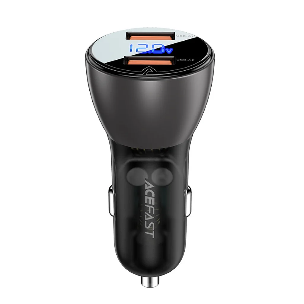 Acefast autós gyorstöltő. 2 USB portja van. Az első USB Type C csatlakozó 27 W maximális teljesítménnyel, egy USB csatlakozó pedig 18 W-ig teszi lehetővé a töltést. Lehetővé teszi a gyors töltést, többek között PPS, Power Delivery, Quick Charge 3.0, AFC és FCP szabványokban. Egyszerre 2 eszköz csatlakoztatható hozzá. Tűzálló PC anyagból készült. Számos védelemmel van ellátva, mint például túlmelegedés, túlfeszültség, nagyfeszültség vagy túlterhelés.