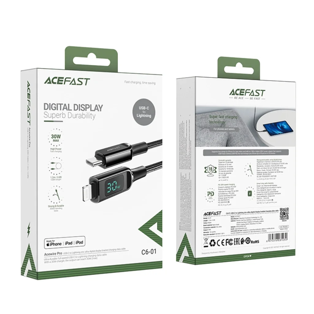 Acefast C6-01 adatkábel Type-C - Lightning, Gyors töltés, 3A, LED kijelző, 1.2m - Fekete