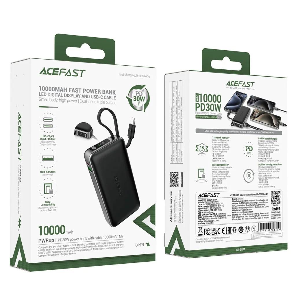 Acefast M7-10000 PD30W Powerbank beépített kábellel – Fekete Fedezd fel a kényelem új szintjét az Acefast M7 powerbankkal – egy megbízható társ a mindennapi kihívások és utazások során. A 10,000 mAh kapacitással és a 30W PD gyors töltéssel mindig biztos lehetsz benne, hogy készülékeid készen állnak az indulásra. A beépített USB-C kábel kiküszöböli a további kábelek hordozásának szükségességét, és a több portos funkcionalitás lehetővé teszi különböző eszközök egyidejű töltését. A modern LED kijelző tájékoztat a töltöttségi szintről, a kompakt és elegáns kialakítás pedig tökéletes illeszkedést biztosít bármilyen zsebhez vagy táskához. Az fejlett biztonsági megoldások garantálják a készülékeid biztonságát, nyugalmat biztosítva a használat során. Engedd meg magadnak a szabadságot és a töltés biztosításának bizonyosságát az Acefast M7-tel! Műszaki adatok:- Márka: Acefast