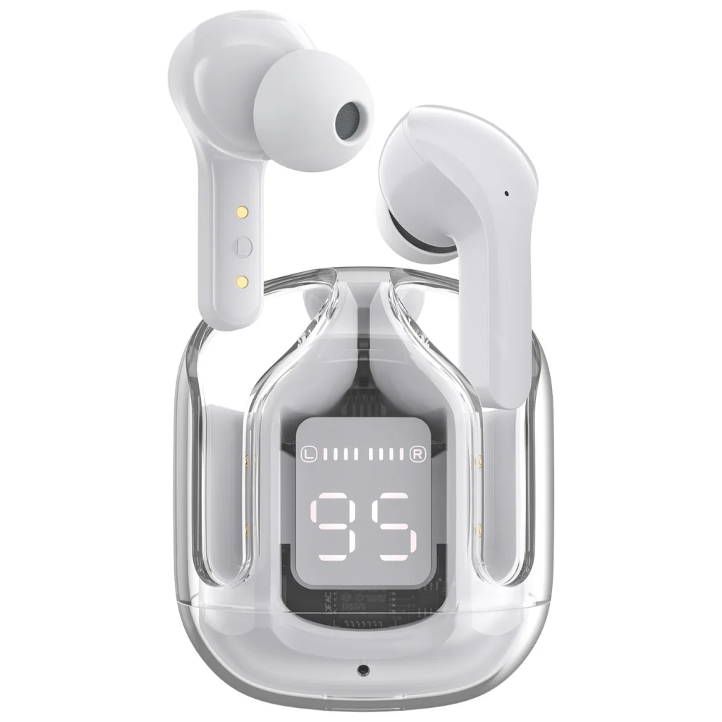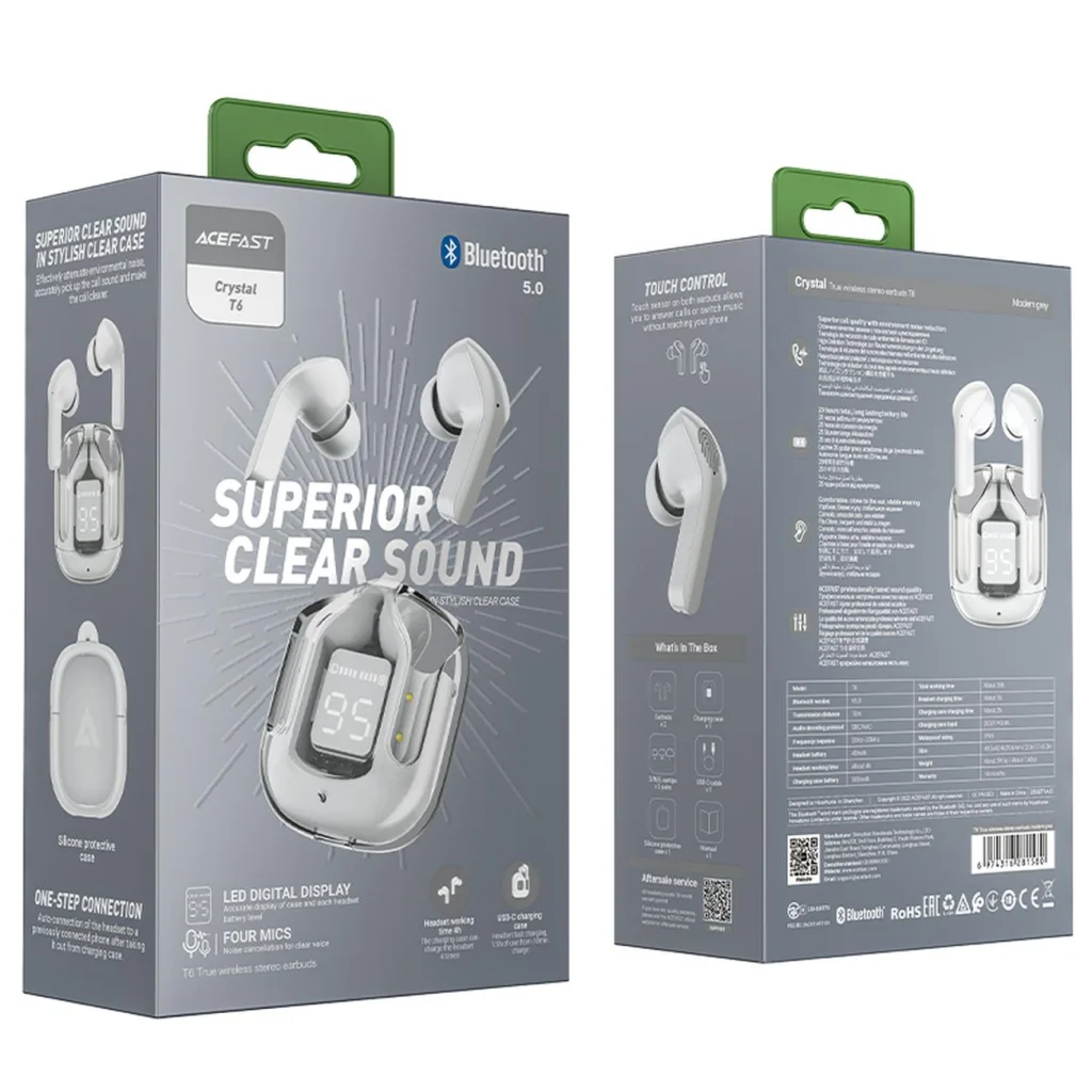 Merülj el a zene világában az Acefast T6 Bluetooth vezeték nélküli fülhallgatóval! A kiváló hangminőség éles magas és tiszta mély hangokkal garantálja, hogy minden hangot tisztán hallj. A fülhallgató egyedi, átlátszó töltőtokja nemcsak stílusos megjelenést kölcsönöz, hanem rajta keresztül a LED digitális kijelző elegánsan mutatja az akkumulátor töltöttségi szintjét mindkét fülhallgató és a tok számára.