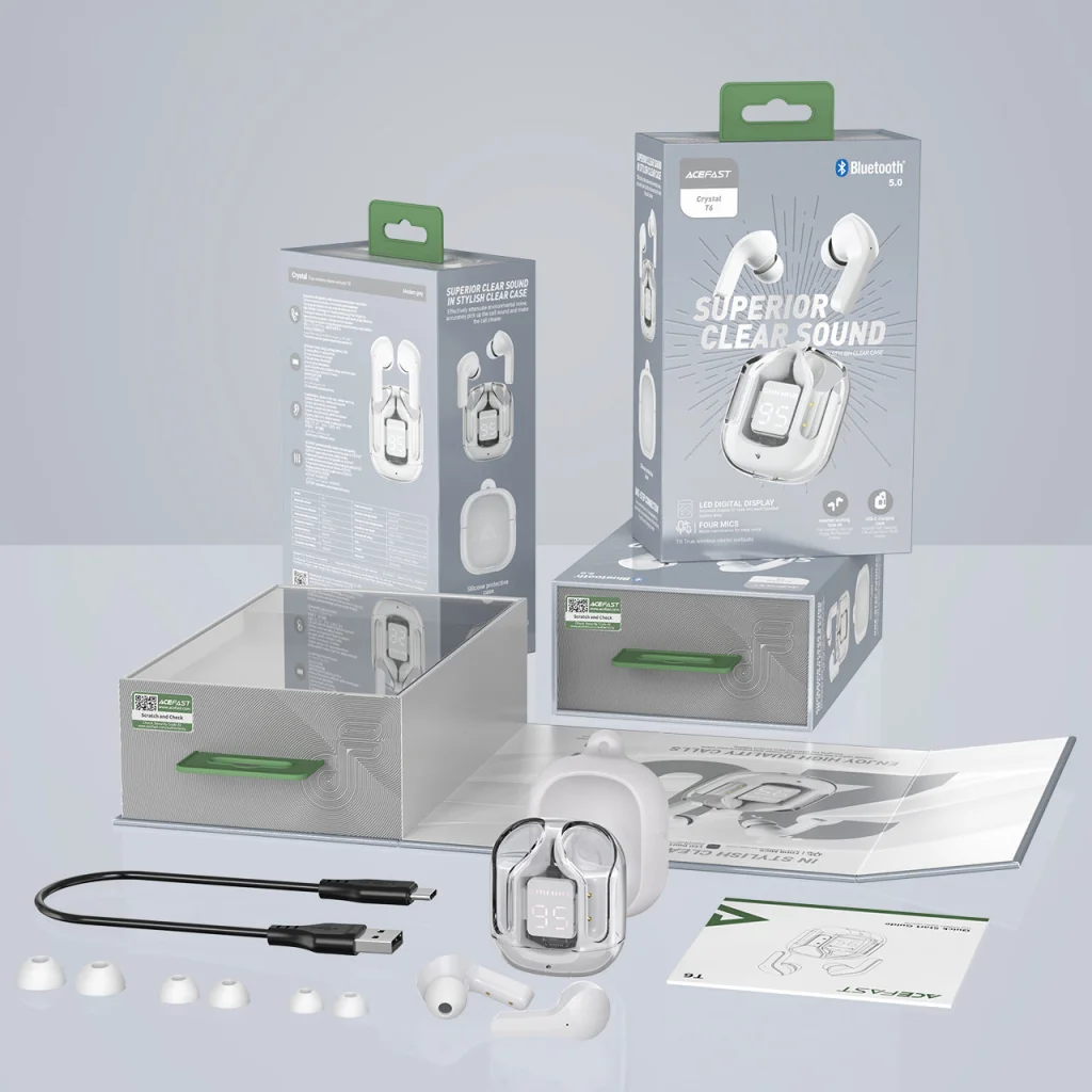 - Tartozékok: Acefast T6 fülhallgatók, töltőtok, USB Type-C töltőkábel, több méretű szilikon fülbetét, szilikon védőtok a töltőtokhoz, használati útmutató