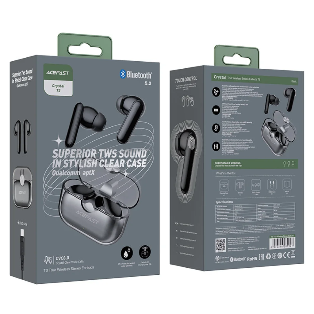 Acefast TWS Bluetooth 5.2 vezeték nélküli fülhallgató, cVc 8.0, aptX, vízálló IPX7 fekete