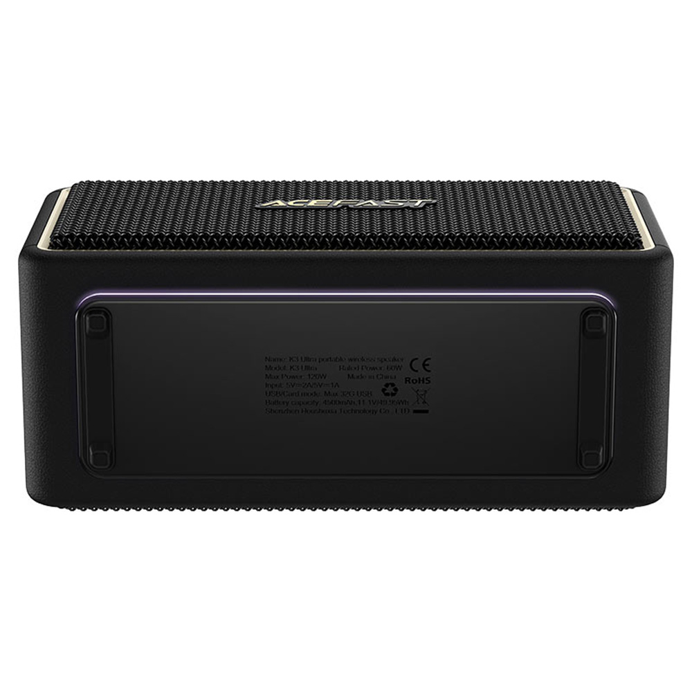 A letisztult fekete design, elegáns arany kerettel és fémrácsos előlappal, prémium megjelenést kölcsönöz a hangszórónak. Az alján található diszkrét RGB világítás tovább fokozza az élményt, hangulatossá téve a környezetet a zene ritmusára. Az "ACEFAST" logó stílusosan díszíti az előlapot.