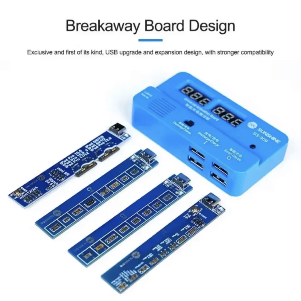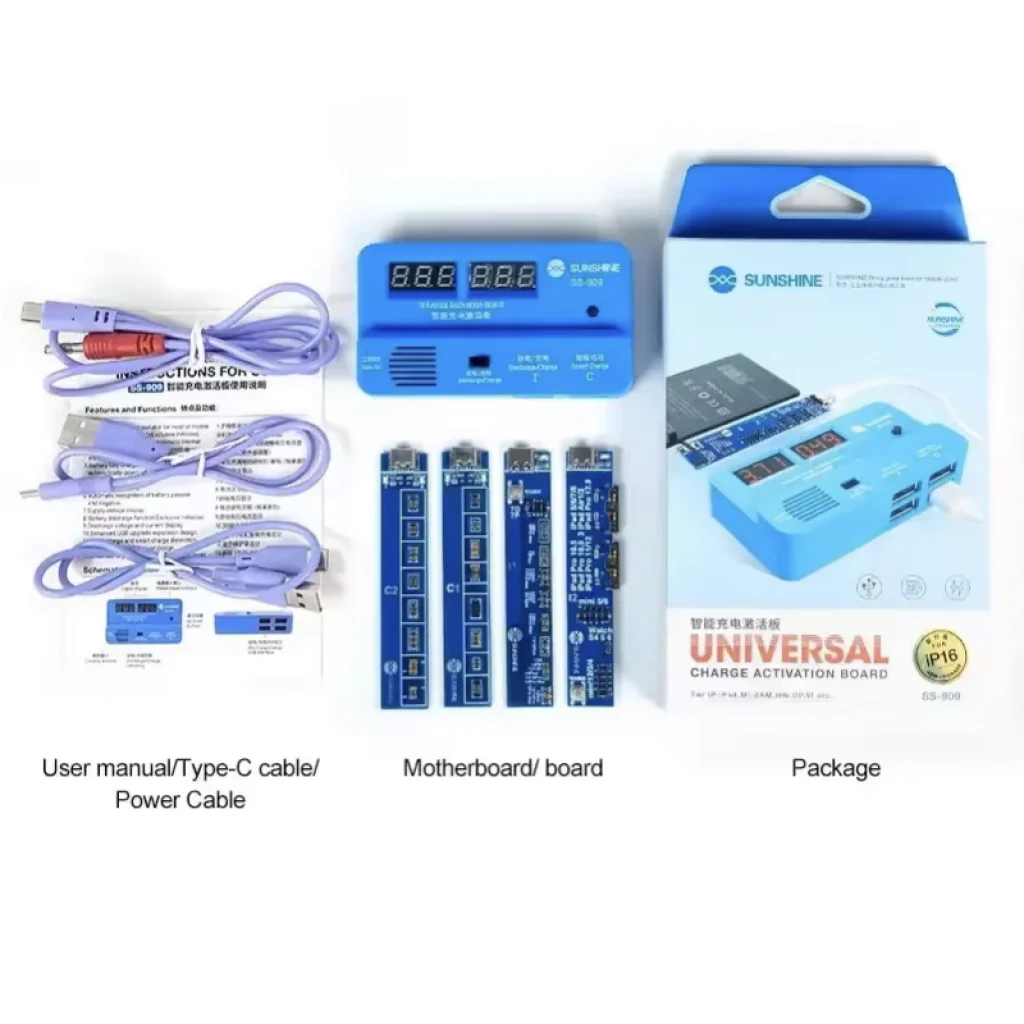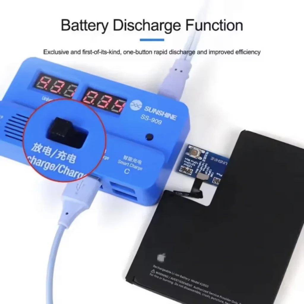 Az Akkumulátor Aktiválási Panel Sunshine SS-909 egy univerzális aktiváló panel, amely gyorsan tölti és aktiválja a legtöbb piacon lévő telefonok és táblagépek, köztük az iPhone, iPad, Huawei, OPPO, VIVO, Xiaomi, Samsung és más készülékek akkumulátorait. Az új és továbbfejlesztett kialakításának köszönhetően, mind megjelenésben, mind csomagolásban, ez a tápegység lényegi funkcionalitást nyújt kompakt és hatékony formában. Az intelligens gyors töltési és kisütési funkciókkal rendelkező Sunshine SS-909 optimalizálja a szervizelési folyamatot. Amikor az akkumulátor teljesen feltöltődik, a tápegység automatikusan megszakítja az áramellátást, és az indikátor lámpa kialszik, biztosítva a biztonságot és megbízhatóságot a használat során.