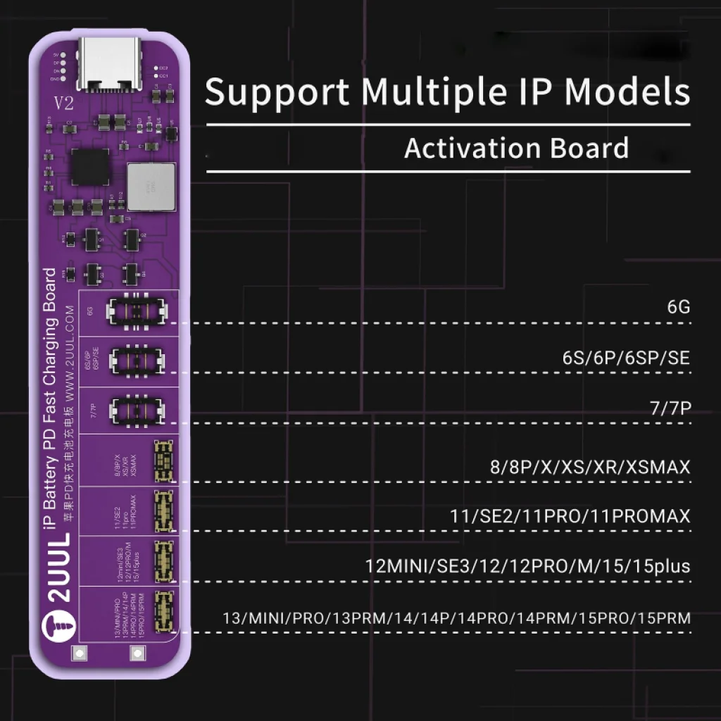 Az 2UUL BT01 Akkumulátor Aktiváló Panel kifejezetten az iPhone 6-tól a 15 Pro Max sorozatig terjedő akkumulátorok aktiválására és gyorstöltésére van tervezve. Támogatja az Akkumulátor PD Gyorstöltési technológiát, amely lehetővé teszi az akkumulátorok hatékony és védett töltését, még akkor is, ha az akkumulátor szintje kritikusan alacsony. Túlterhelésvédelemmel és automatikus polaritásfelismeréssel (pozitív/negatív) rendelkezik, biztosítva a biztonságos és stabil működést. A nem szétszerelhető kivitele megkönnyíti a használatát, időt és energiát takarítva meg javítás vagy diagnosztika során.