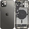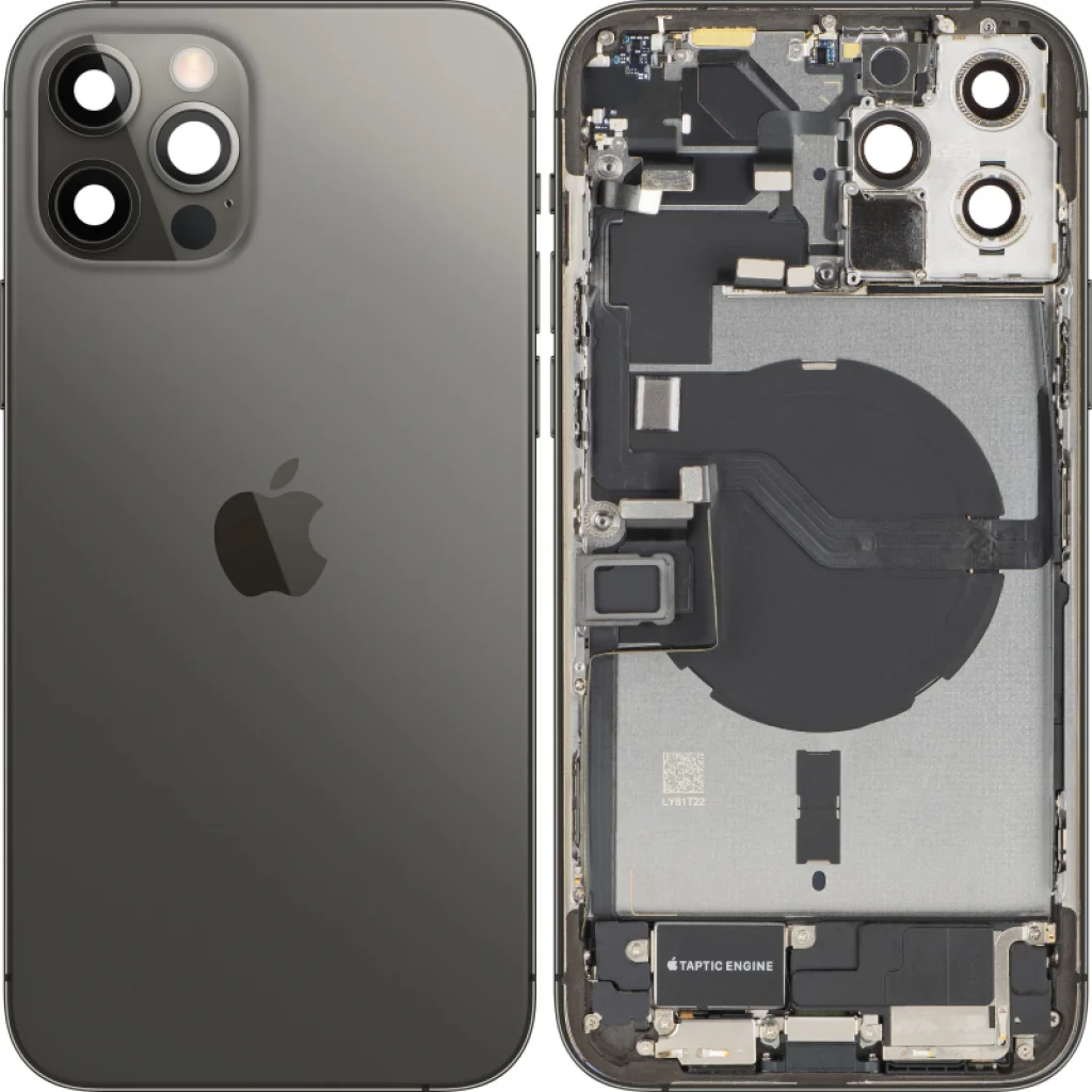Az Apple iPhone 12 Pro Max készülékhez készült akkumulátor fedő középső kerettel - Grafit színű, használt (A osztály). Az Apple licenc alapján készült pótalkatrész, amely a sérült alkatrész cseréjére szolgál a telefonodon. Középső kerettel, oldalsó gombokkal, kameravédő üveggel, vakuüveggel, SIM-tálcával, NFC antennával, vezeték nélküli töltési indukciós tekercsel, taptic motorral, töltőcsatlakozó flex kábellel, hangszóróval és akkumulátor ragasztóval felszerelt.