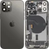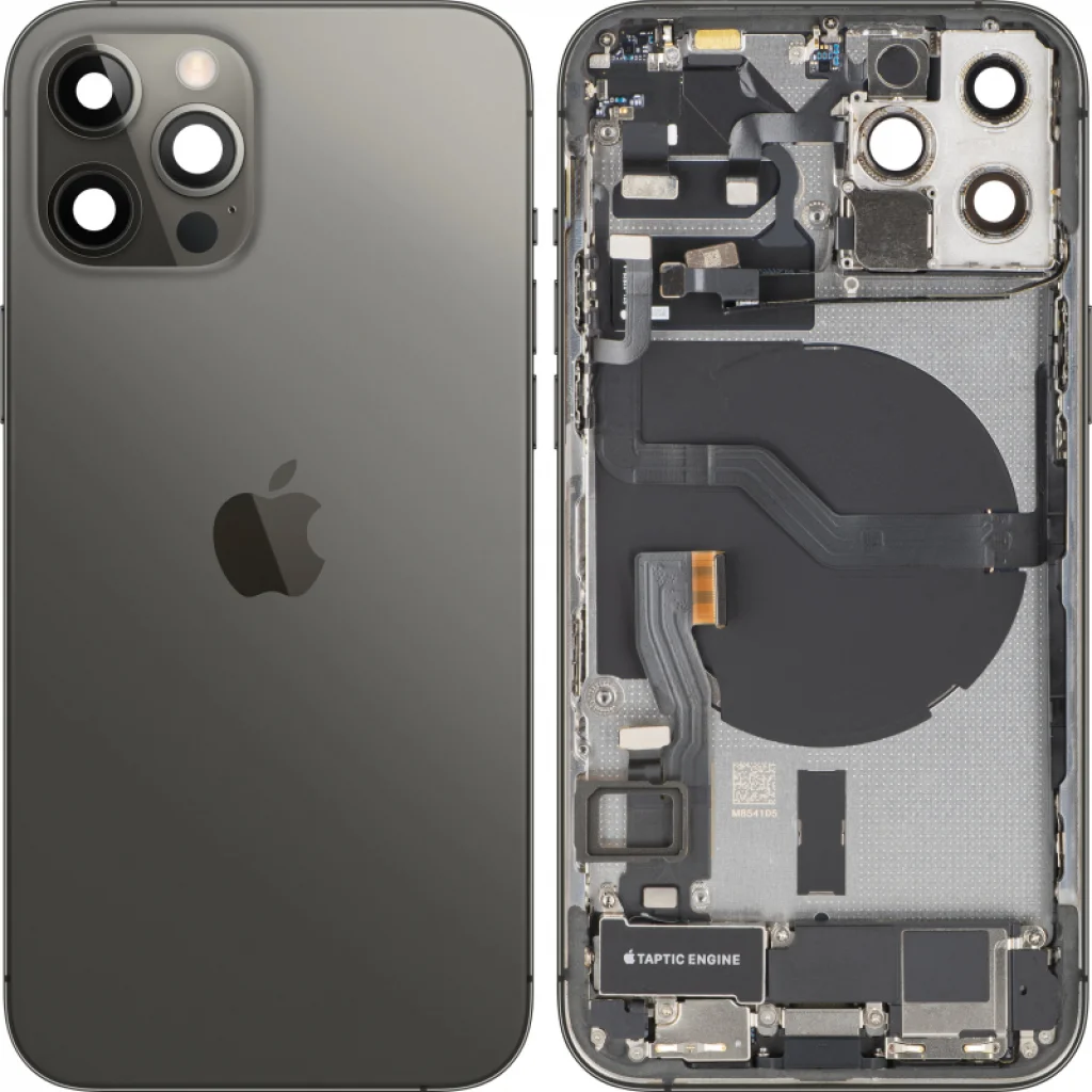 Akkumulátorfedél / Hátsó üveg középső kerettel Apple iPhone 12 Pro-hoz - Grafit bontott (A osztály). Apple engedéllyel rendelkező pótalkatrész, amely a sérült alkatrész cseréjére szolgál a telefonján. Felszerelve középső kerettel, oldalsó gombokkal, kameraüveggel, vakuüveggel, SIM tálcával, NFC antennával, vezeték nélküli töltés indukciós tekercsével, taptic engine-nel, töltőport flex kábellel, hangszóróval és akkumulátor ragasztóval.