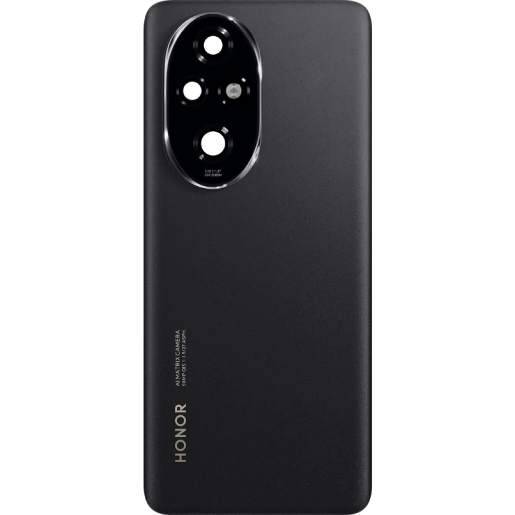 Akkumulátorfedél Honor 200 Pro készülékhez - fekete Pótalkatrész Honor licenc alapján, amelyet a telefon sérült részének cseréjére használnak. Tartalmaz ragasztót és kameravédő lencsét.