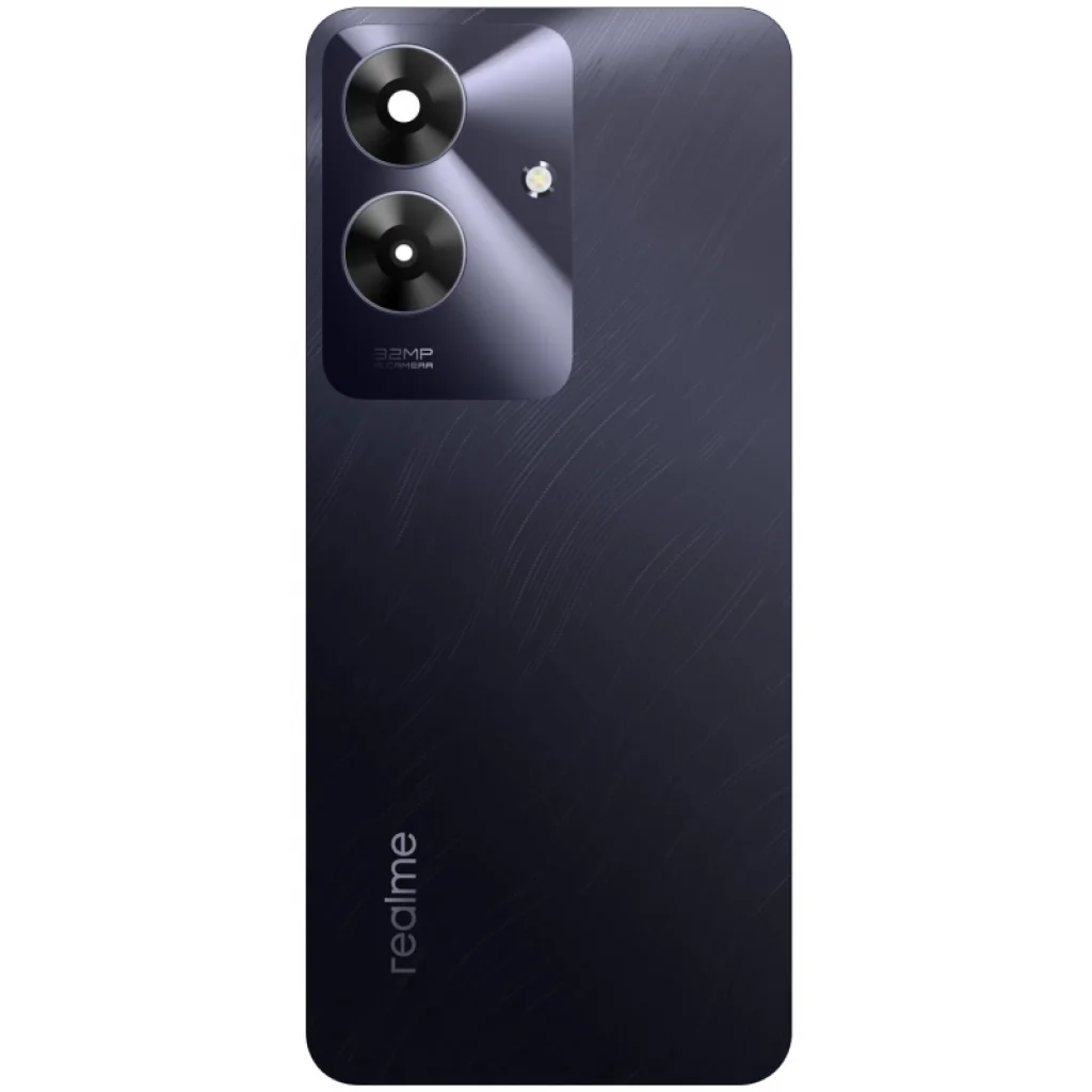 Akkumulátorfedél Realme Note 60 modellhez - Márványfekete. Ez egy pótalkatrész a Realme licencelésével, amelyet a készülék sérült részének cseréjére használnak. A csomag tartalmaz ragasztót és kamera lencsét is.
