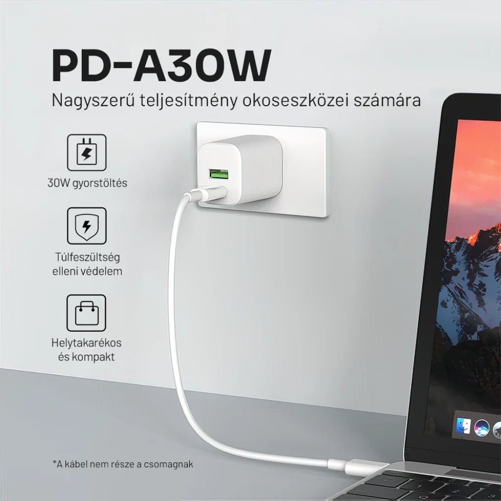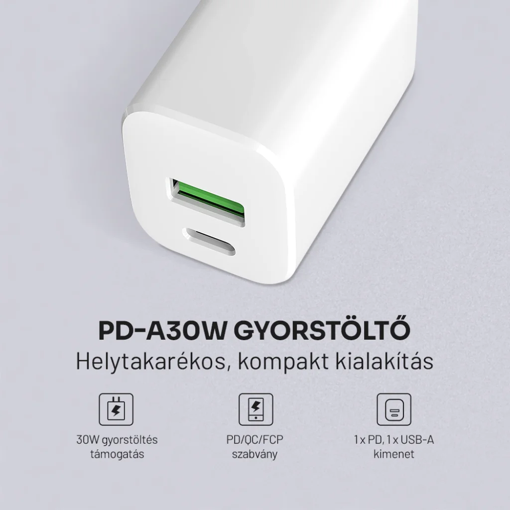Alphajack PD-A30W hálózati töltő adapter, 1xType-C/USB-C(PD), 1xUSB-A 30W. Helytakarékos, kompakt kialakítás. Kiváló minőségű komponensekből, prémium gyorstöltőfej. Egyidőben akár kettő eszközt is tölthetünk, legyen szó a régebbi USB-A töltőkábeles eszközökről, vagy az újabb PD-Type-C fejekről. Használható iPhone-hoz, iPad-hez, Samsung telefonokhoz, Huawei telefonokhoz, Xiaomi telefonokhoz, igazából minden készülékhez, ami Type-C(PD) illetve USB-A töltőkábellel rendelkezik.