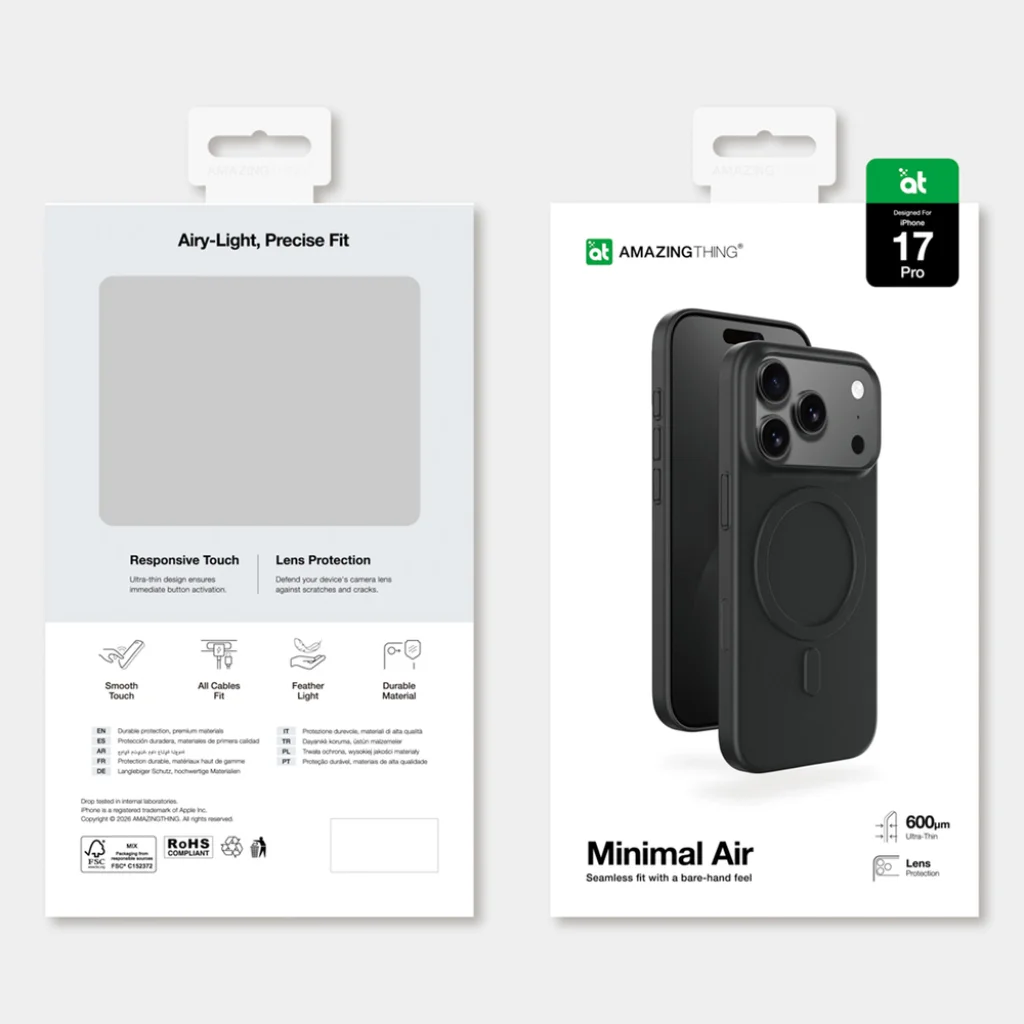Az AmazingThing Minimal Air tokot úgy tervezték, hogy megvédje telefonját, miközben megőrizze annak karcsú megjelenését. Mindössze 600 mikrométer vastagságával a tok szinte észrevétlenül simul a kézbe, a sima felület kényelmes fogást biztosít. A könnyű kialakítás nem növeli jelentősen a készülék méretét, a kamera körüli megemelt élek pedig megvédik a lencséket a karcolásoktól és repedésektől. A tok teljes mértékben kompatibilis a MagSafe kiegészítőkkel és lehetővé teszi a kényelmes kábelkezelést. A pontos illeszkedés révén a telefon gombjai teljesen szabályosak maradnak, biztosítva a kényelmes mindennapi használatot.