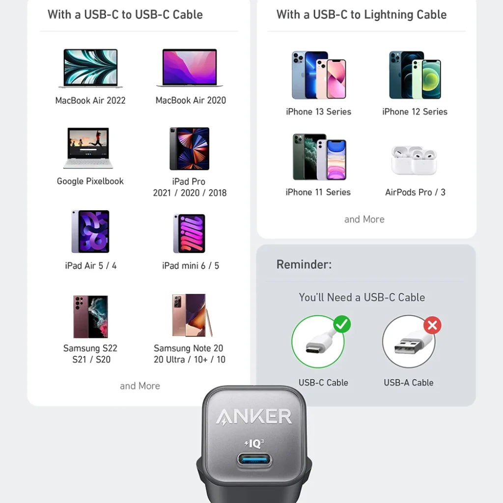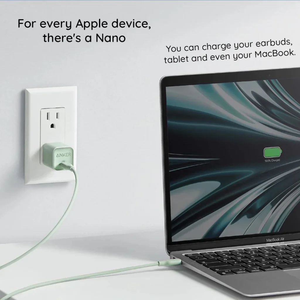 Az Anker 511 Nano 3 egy valóban sokoldalú töltő, amely képes szinte minden modern eszköz töltésére. Kifejezetten optimalizált az Apple ökoszisztémához: