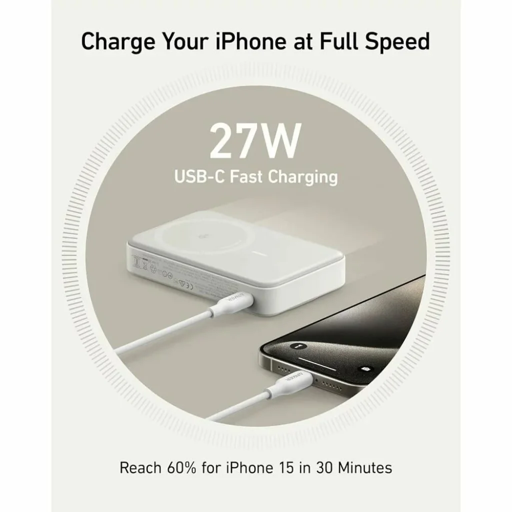 - Villámgyors USB-C töltés: Ha a vezetékes töltést preferálod, a 27W-os USB-C kimenet lenyűgöző teljesítményt nyújt. Egy iPhone 15 készüléket mindössze 30 perc alatt 60%-ra tölthetsz vele, ami garantálja, hogy pillanatok alatt visszatérhetsz a dolgaidhoz.