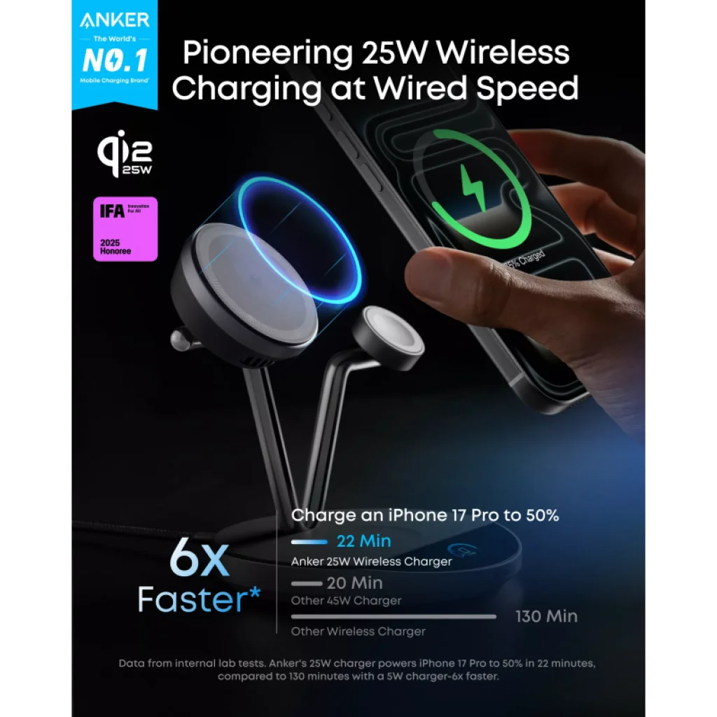 Élvezze a vezetékes töltés sebességét vezetékek nélkül! Az Anker Prime MagGo AirCool 3 az 1-ben töltő a legújabb Qi2 25W-os technológiával akár 6x gyorsabban tölt, mint a hagyományos 5W-os vezeték nélküli töltők. Egy iPhone 17 Pro készüléket például mindössze 22 perc alatt 50%-ra tölthet fel, ami szinte azonos egy 45W-os vezetékes töltő teljesítményével. Ez a készülék az IFA 2025 Honoree kitüntetéssel is elismert innováció, a világ leggyorsabb MagSafe kompatibilis töltője.