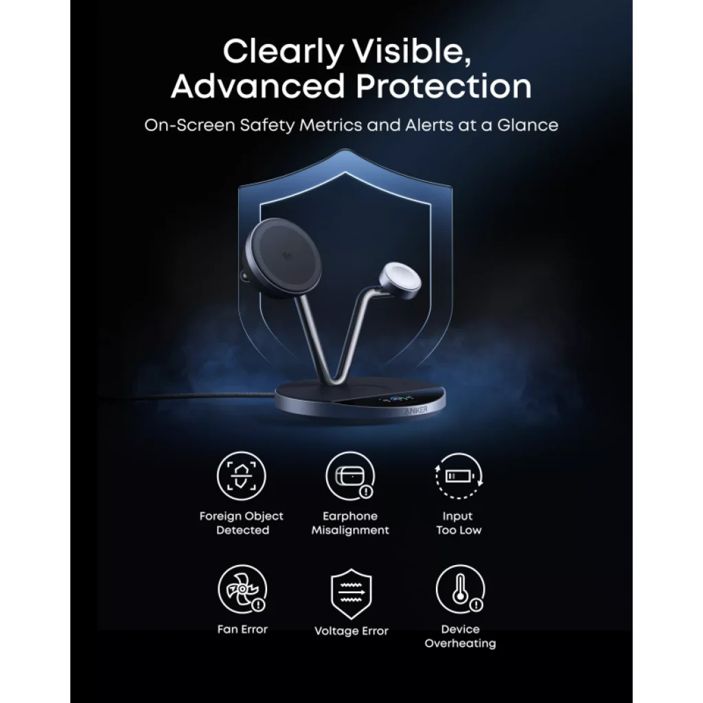 Az Ön eszközeinek biztonsága a legfontosabb. Az Anker Prime MagGo AirCool töltő fejlett védelmi funkciókkal rendelkezik, melyekről a kijelzőn keresztül is értesítést kaphat: