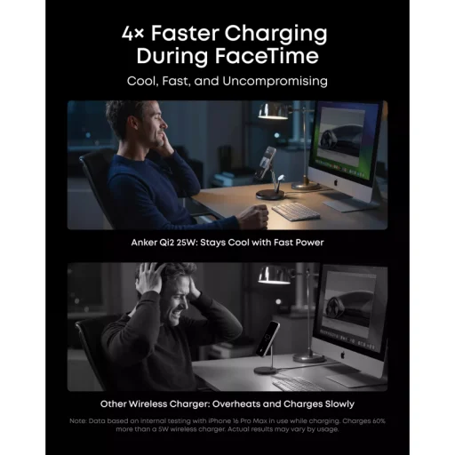 Folyamatosan használja telefonját töltés közben? Az Anker Prime MagGo AirCool akár 4x gyorsabb töltést biztosít olyan intenzív használat mellett is, mint például a FaceTime videóhívások, anélkül, hogy a készülék túlmelegedne vagy lassulna. Maradjon kapcsolatban, dolgozzon vagy szórakozzon anélkül, hogy kompromisszumot kellene kötnie a töltési sebesség terén – mindezt hűvösen és kompromisszumok nélkül.