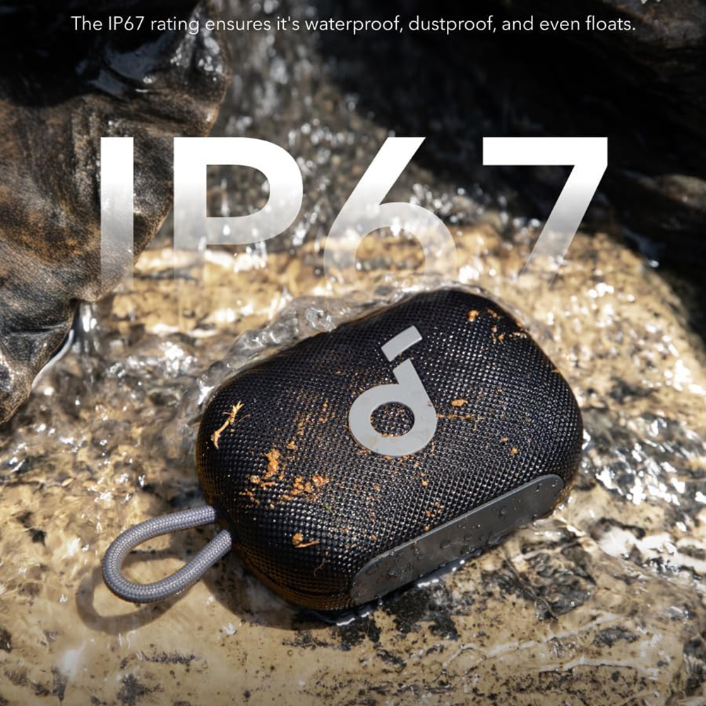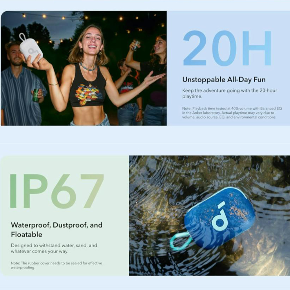 Az IP67-es por- és vízállósági besorolásnak hála a Soundcore Select 4 Go mindent kibír, amit az élet és a természet tartogat. Merülj el a zenében anélkül, hogy aggódnod kellene a vízfröccsenés, a por, vagy akár a homok miatt. Sőt, a hangszóró még lebeg is a vízen, így gondtalanul élvezheted a medence partján vagy a tavon is. Fontos: a hatékony vízállóság érdekében a gumiborításnak lezárva kell lennie.
