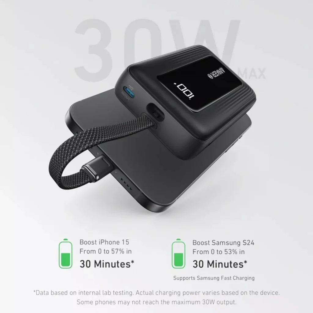 A powerbank bemeneti töltése is kiemelkedően gyors, 20W-os sebességgel, így maga az eszköz is pillanatok alatt feltölthető.