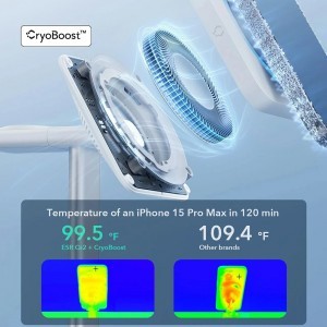 Tapasztalja meg a hihetetlen sebességet! Az ESR Qi2 és CryoBoost kombinációja lehetővé teszi, hogy egy iPhone 15 Pro Max készüléket mindössze 2 óra alatt teljesen feltöltsön, szemben más márkák 3 órás átlagával. A CryoBoost aktív hűtése stabilan tartja a készülék hőmérsékletét (mindössze 37.5 °C / 99.5 °F 120 perc után), megakadályozva a túlmelegedést, ami hozzájárul az akkumulátor hosszú távú élettartamának megőrzéséhez és a töltési sebesség fenntartásához.