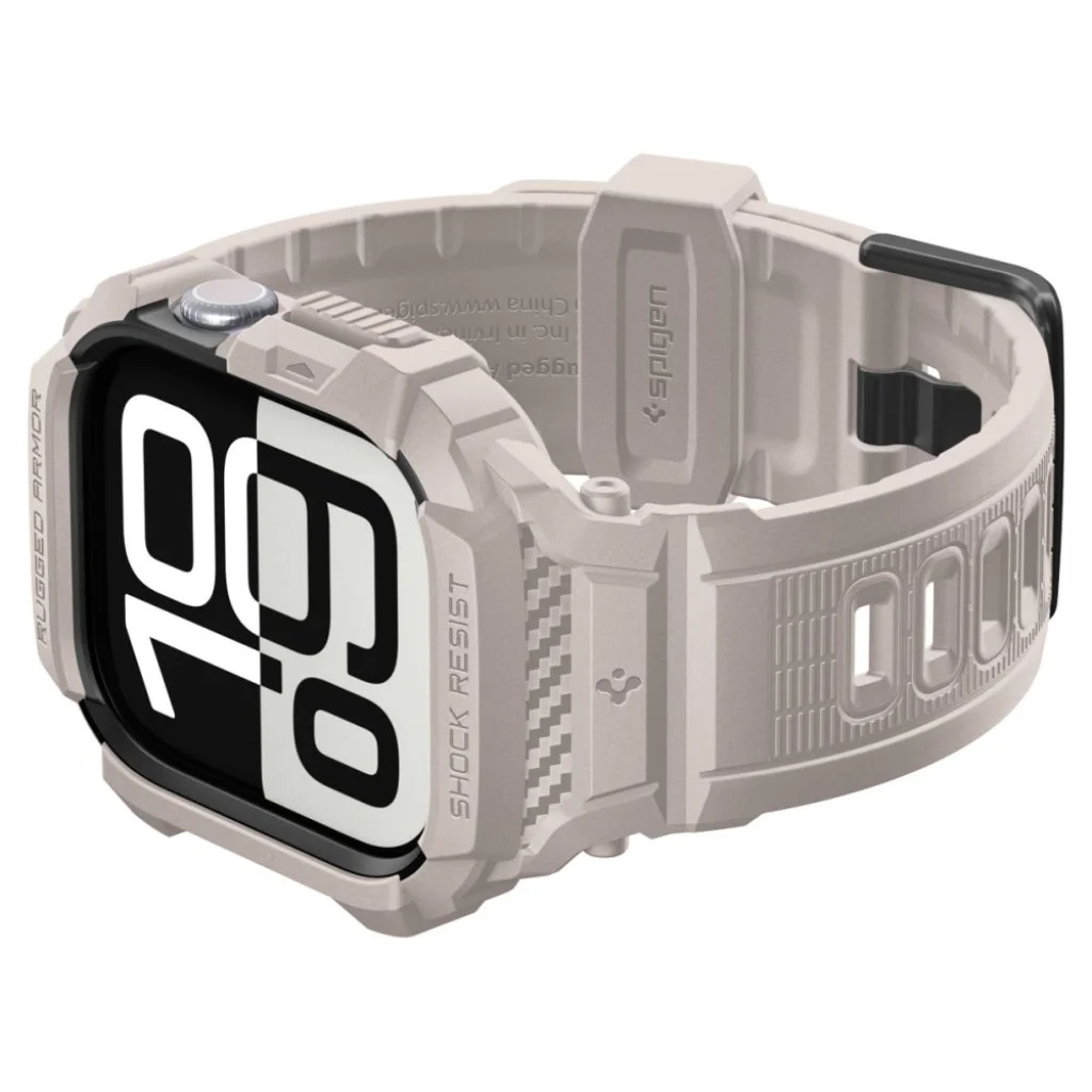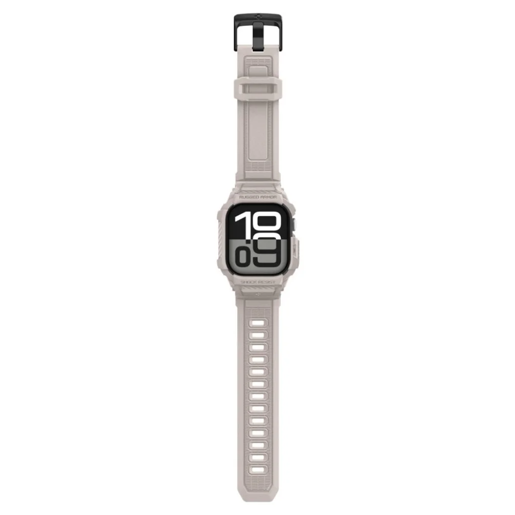 Kényelmes, sportos stílusú Spigen Rugged Armor Pro szíj, amely rugalmas TPU anyagból készült, szénszálas díszítésekkel. Integrált tokkal rendelkezik, kiemelt peremekkel, amely védelmet nyújt az óra tokjának karcolódása és ütése ellen. A szíj teljesen funkcionális és egyénileg állítható.