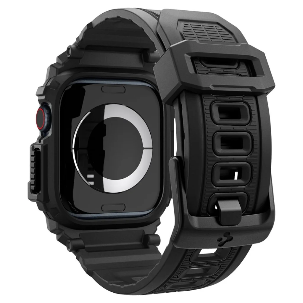 Kényelmes, sportos stílusú Spigen Rugged Armor Pro szíj, amely rugalmas TPU anyagból készült, karbon szálas akcentusokkal díszítve. Beépített tokkal rendelkezik, emelt peremekkel, ami védi az óra tokját a karcolásoktól és ütésektől. A szíj teljesen funkcionális, és egyéni igények szerint állítható.