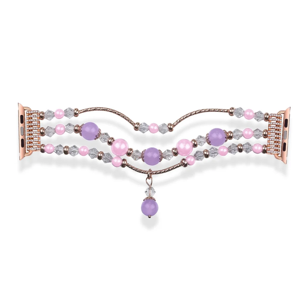 Okosóra szíj divatos kivitelben, csillogó kristályokkal és gyöngyökkel díszítve. Bőrbarát rozsdamentes acélból készült, kényelem használat közben. Az állítható pánt segít a csuklójához igazítani a hosszát. Gyors és egyszerű szíjcsere.