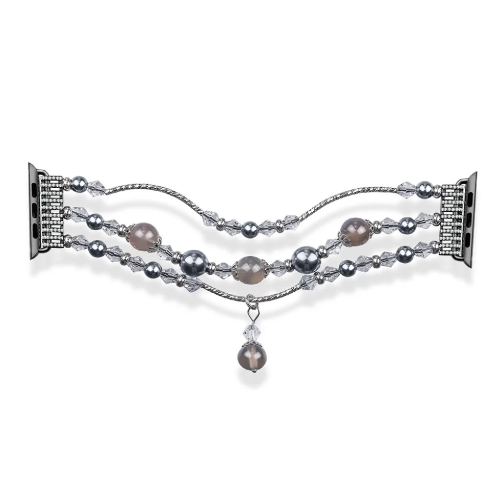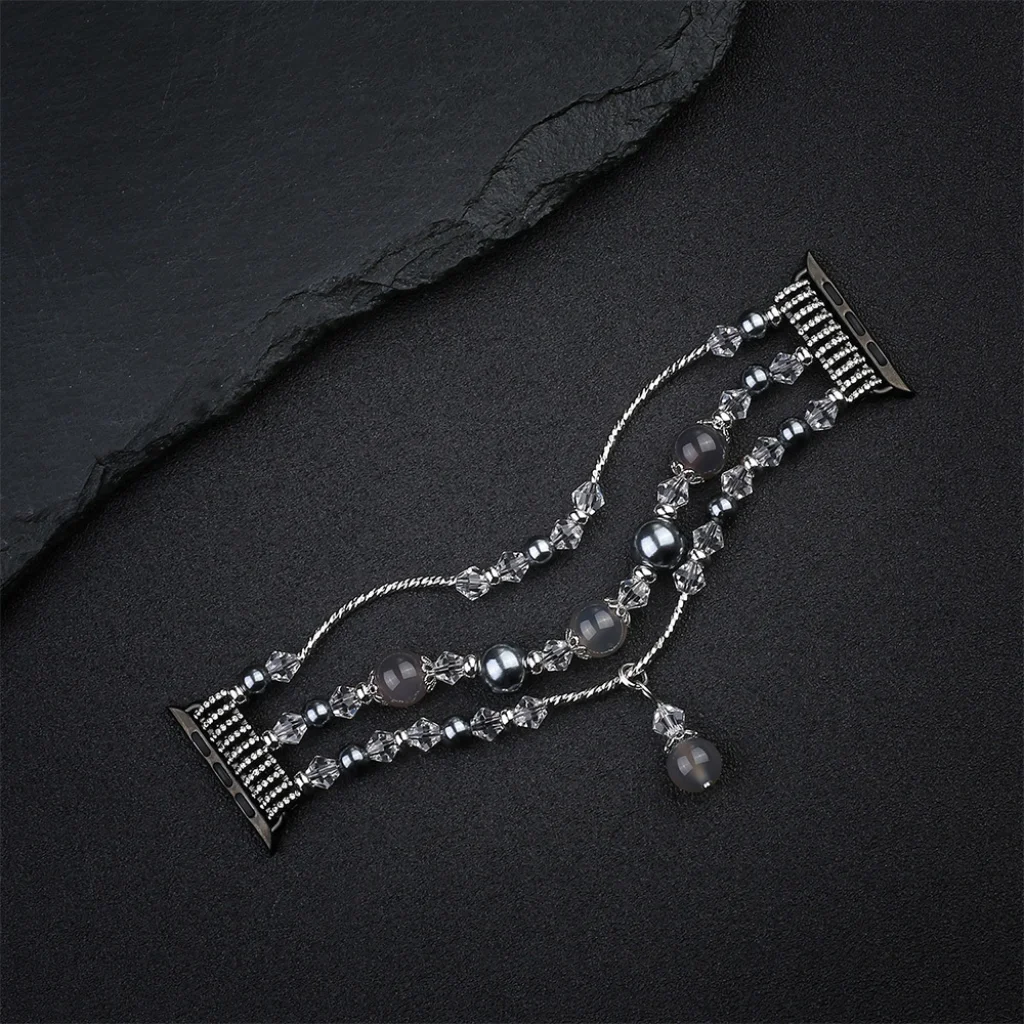 Okosóra szíj divatos kivitelben, csillogó kristályokkal és gyöngyökkel díszítve. Bőrbarát rozsdamentes acélból készült, kényelem használat közben. Az állítható pánt segít a csuklójához igazítani a hosszát. Gyors és egyszerű szíjcsere.