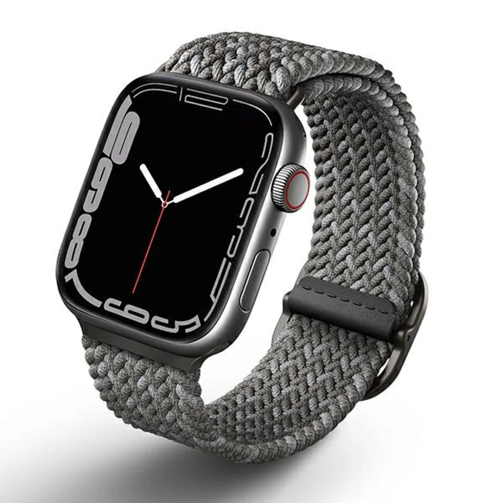 UNIQ Aspen - Puha, légáteresztő, kényelmes szíj, amely rugalmas Weavex™ anyagból készült. Minden szíjat kiváló minőségű poliészter szálakkal szőnek, amelyek ellenállnak a kopásnak, izzadságnak és fröccsenéseknek. Csúsztassa a rozsdamentes acél csatot, és állítsa be a szíjat az igényeinek megfelelően, viselje kényelmesen és praktikusan. Gyűjtemény: Aspen, Típus: Szíj, Hossz: 12-21 cm, Szín: Szürke, Kompatibilitás: Apple Watch 42/44/45 mm (Series 1/2/3/4/5/6/7/8/9/SE/SE2/SE3)