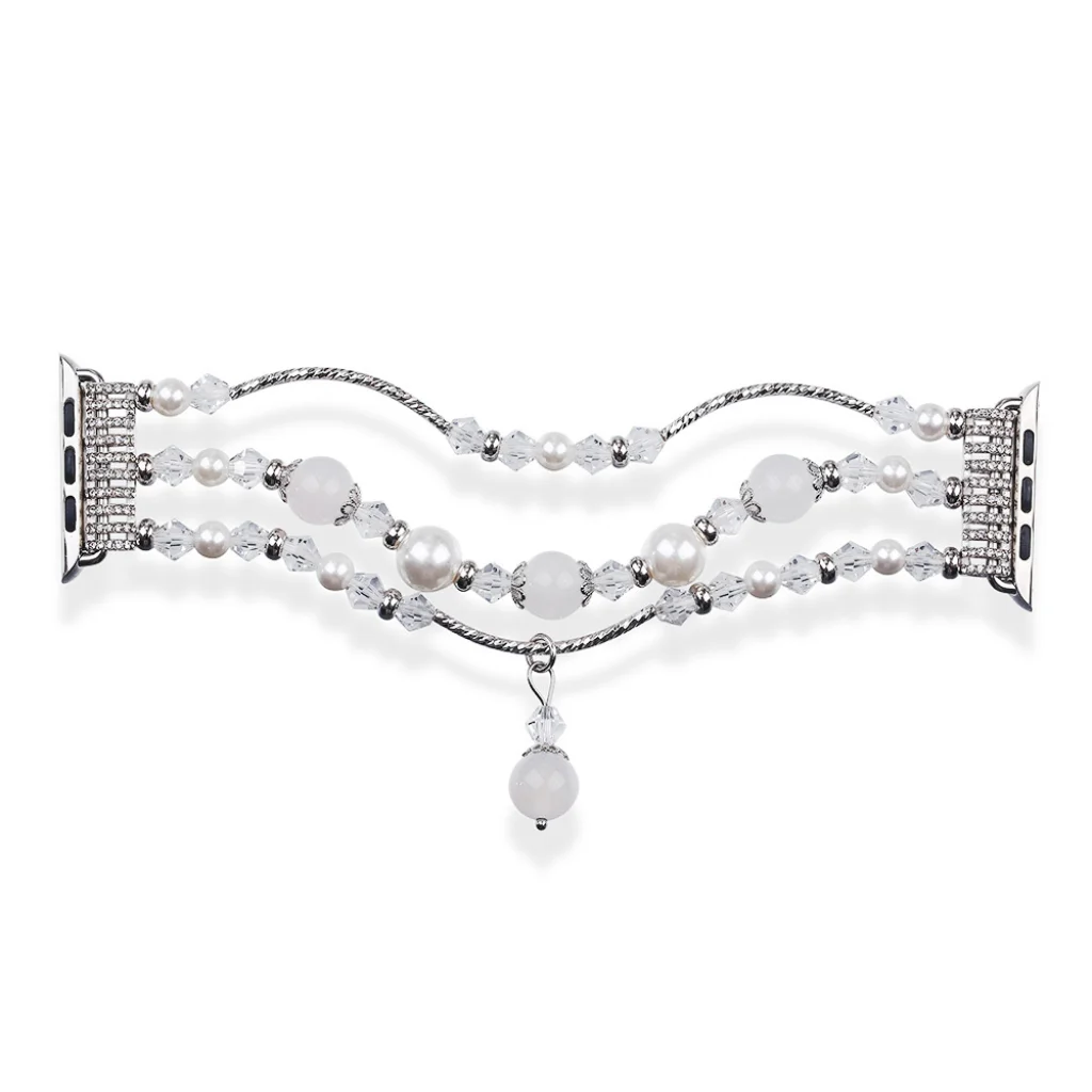 Okosóra szíj divatos kivitelben, csillogó kristályokkal és gyöngyökkel díszítve. Bőrbarát rozsdamentes acélból készült, kényelem használat közben. Az állítható pánt segít a csuklójához igazítani a hosszát. Gyors és egyszerű szíjcsere.