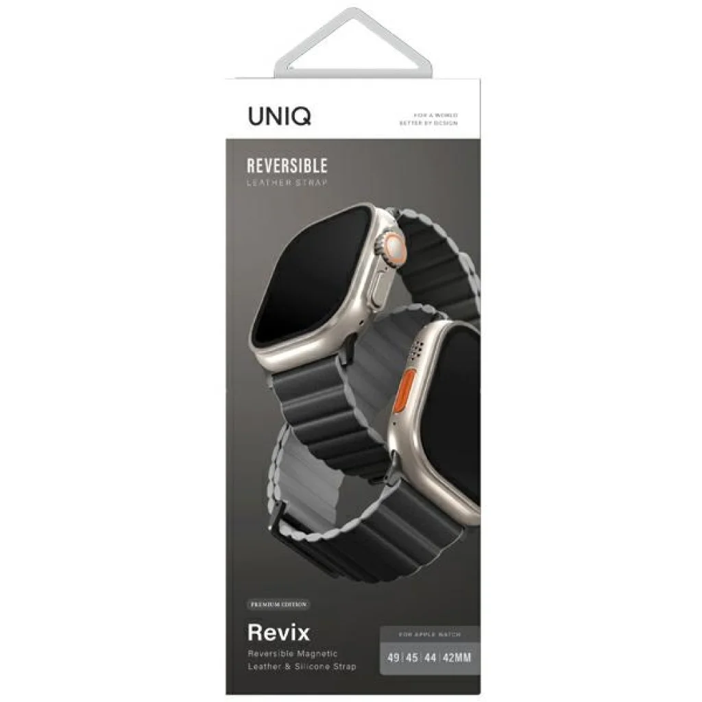 Az Uniq Revix Premium Edition egy egyedülálló mágneses szíj, amelyet a legfelső szintű Apple Watch felhasználók számára terveztek. Ez lehetővé teszi a színekkel való játékot és egyedi színkombinációk létrehozását. A szíj két különböző színt tartalmaz, amelyek könnyen megfordíthatók, így három különböző viselési módot kínálva és lehetővé téve a különböző stílusok kipróbálását. Az innovatív mágneses szíj 28 erős neodímium mágnessel van felszerelve, ami kivételes kényelmet biztosít a használat során. A robusztus mágneses rögzítés akár 1,2 kg szakítószilárdságra is tesztelt, biztosítva a tartósságát. A szíj nagyon jól állítható, lehetővé téve a majdnem tökéletes illeszkedést a csuklón. A szíj kiváló minőségű, vízálló és mosható szilikonból és puha tapintású szintetikus bőrből készült, így nemcsak tartós, hanem nagyon kényelmes is az egész napos viselet során. Műszaki adatok: Kollekció: Revix Premium Edition Típus: Szíj Hosszúság: 13-21 cm Anyag: Szilikon/Szintetikus bőr Szín: Szürke Kompatibilitás: Apple Watch 42/44/45/49 mm, Series 1/2/3/4/5/6/7/8/9/SE/SE2/SE3/Ultra/Ultra 2/Ultra 3.