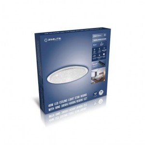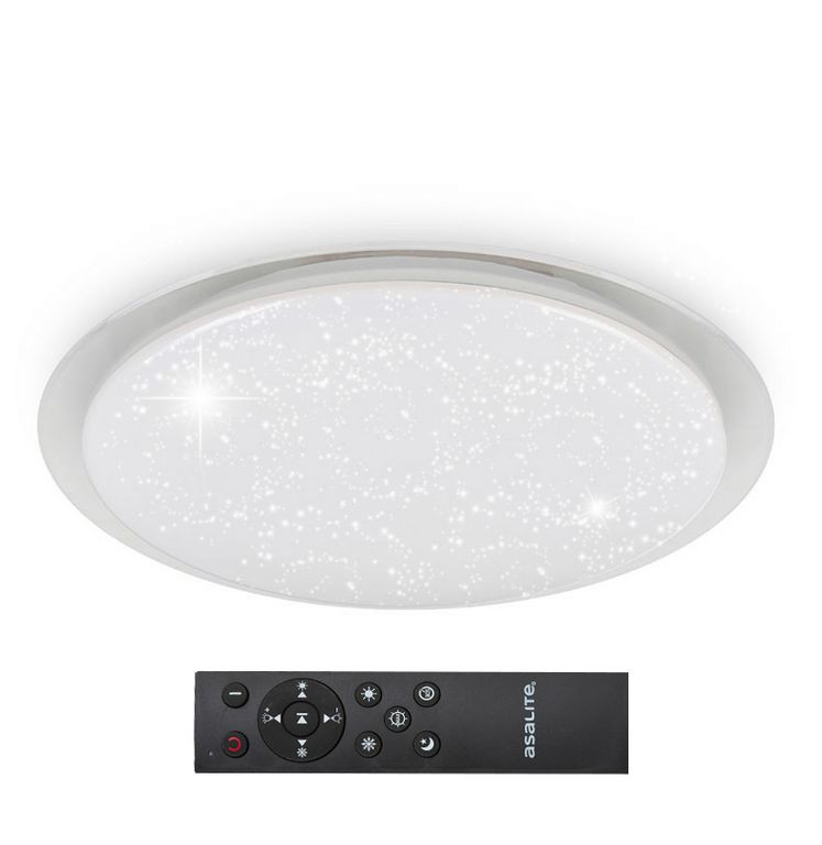 A LED fényforrásokat tartalmazó Asalite LED Mennyezeti Lámpa a jó minőségű és megbízható Led-chipeknek és drivernek, valamint a modern kerek formának és a csillagmintás búrának köszönhetően dekoratív és hosszú távú megoldást jelentenek a lakásának egyenletes, esztétikus és a szemnek is kellemes megvilágítására. A CCT-s (változtatható színhőmérséklet) Mennyezeti Lámpáknak 3000K és 6500K között a színhőmérséklete és a fényereje is egyaránt fokozatmentesen állítható a csomagolásban található távirányítóval.
