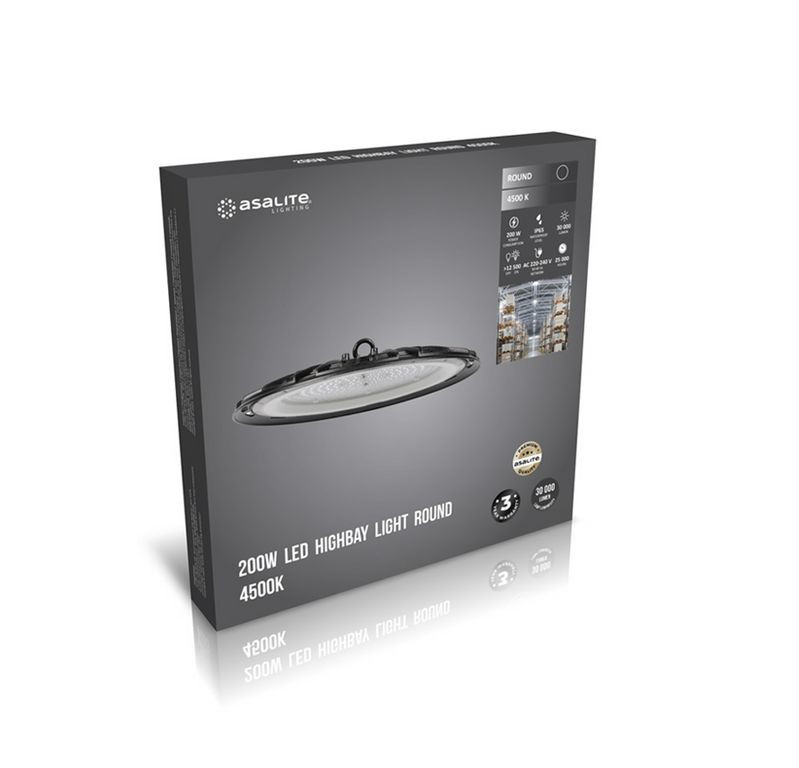 Az Asalite LED Csarnokvilágító 200W 4500K a 200W teljesítmény mellett 30000 lumen fényerősség elérésére képes. A teret 90°-ban képes bevilágítani, így optimális választás raktárak, logisztikai központok, ipari létesítmények, autószalonok, nagy belmagasságú terek, üzletközpontok megvilágítására.