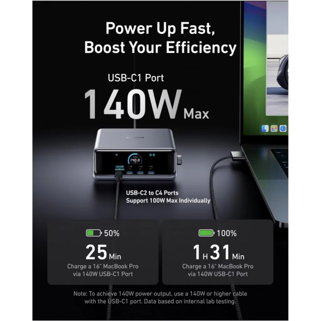 - Rugalmas USB-C töltés: A többi USB-C port (C2, C3, C4) egyenként akár 100W kimenetet is támogat, így egyszerre több eszközöd is gyorstöltésben részesülhet.