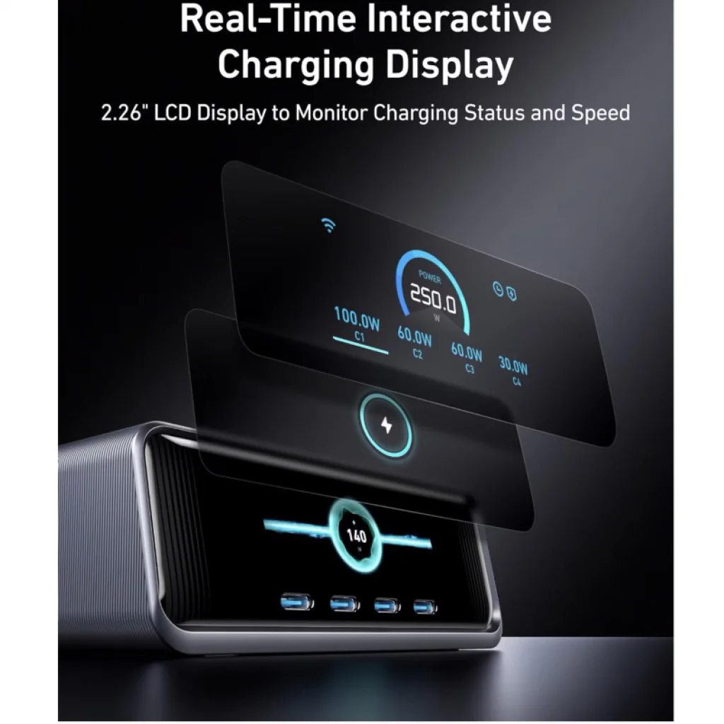 - 2.26 hüvelykes LCD kijelző: Az interaktív kijelzőn valós időben követheted nyomon a töltési állapotot, a sebességet és az egyes portokra jutó teljesítményt. Precíz vizuális visszajelzést kapsz mindenről.