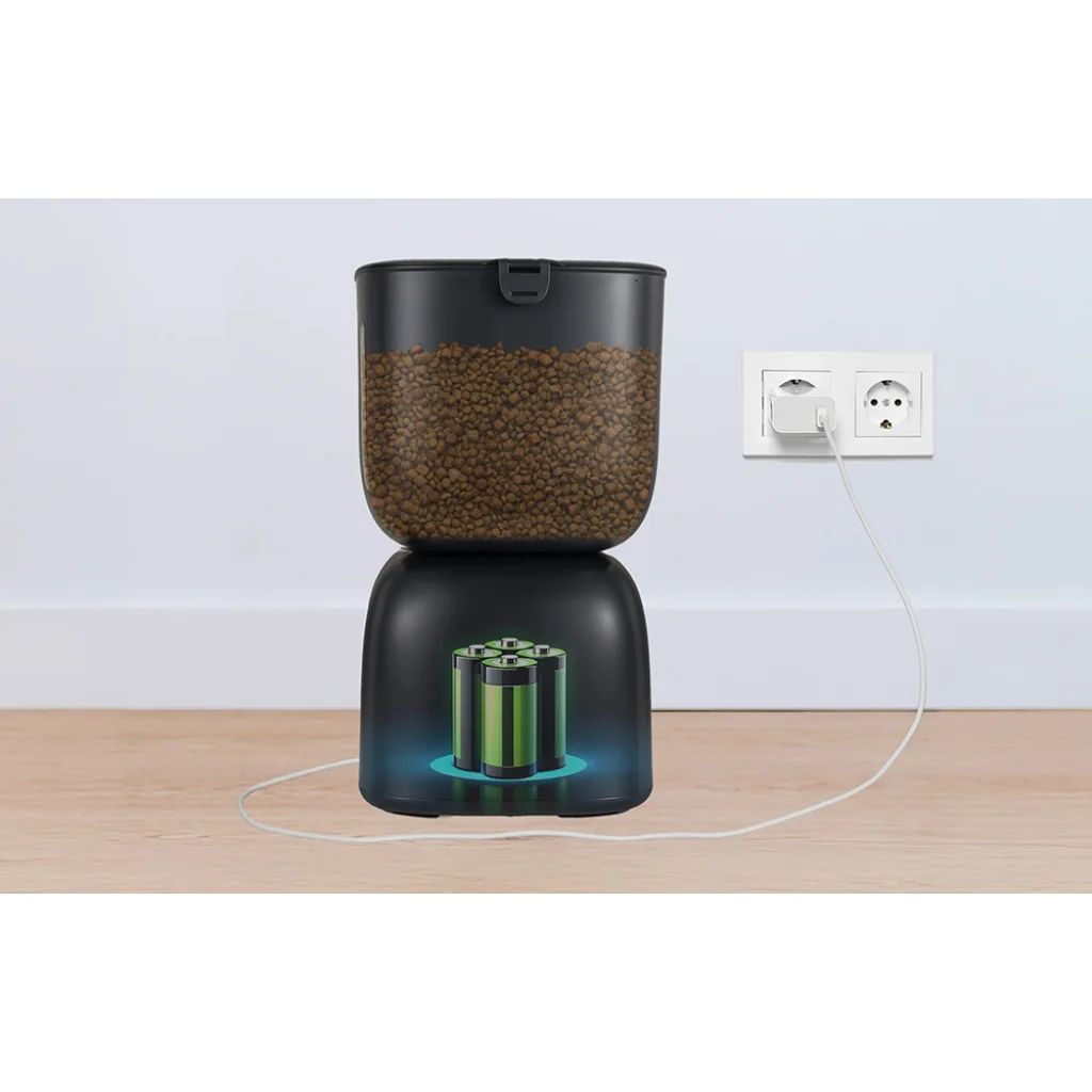 Az adagolót kétféleképpen táplálhatod - kábellel vagy D típusú alkáli elemekkel (nem tartozék), ami garantálja a megszakítás nélküli működést akár 180 napig. Ezzel a lehetőséggel biztos lehetsz benne, hogy kedvenced mindig megkapja az eledelt, függetlenül az esetleges áramkimaradásoktól.