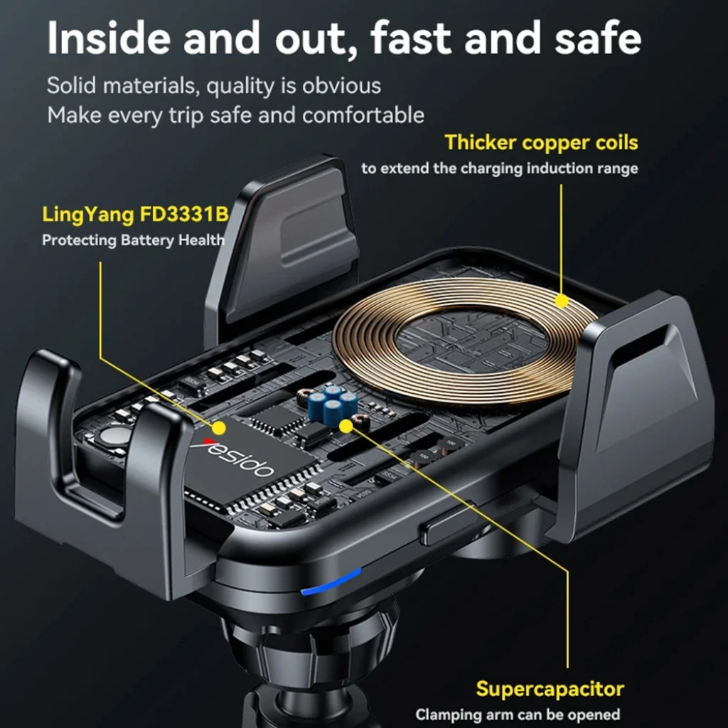 A Yesido C312 autós tartó beépített 15W-os vezeték nélküli töltési funkciójával gyorsan és hatékonyan töltheti készülékét utazás közben. A vastagabb réztekercsek a töltés indukciós tartományát kiterjesztik, biztosítva a megbízható energiaátvitelt. Emellett a LingYang FD3331B chip védi az akkumulátor élettartamát, így nem kell aggódnia a telefonja egészségéért.