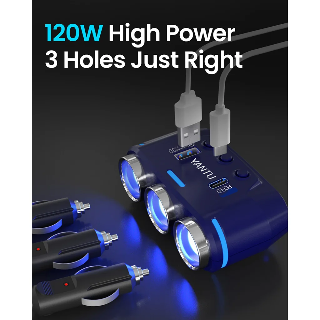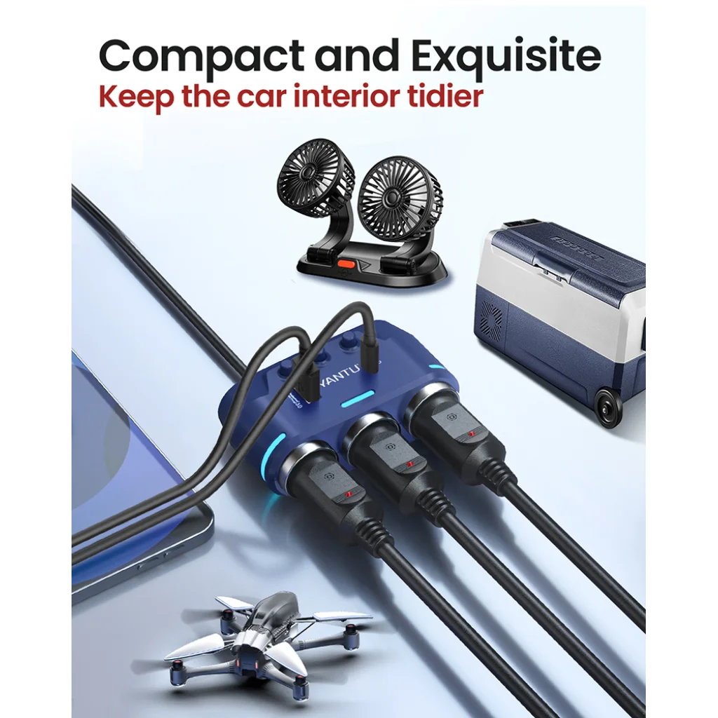 Több eszköz egyidejű töltése: 3 szivargyújtó aljzattal és 2 USB-porttal akár 5 eszközt is képes egyszerre tölteni, minden töltési igényt kielégítve.