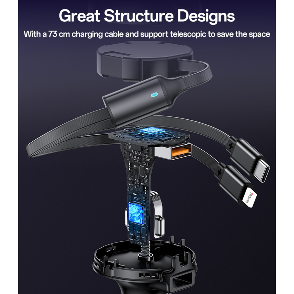 A Yesido Y61 egyik legkiemelkedőbb jellemzője a két, teleszkóposan visszahúzható töltőkábel (Type-C és Lightning). A 73 cm-es maximális hossznak köszönhetően kényelmesen elérhetőek, ugyanakkor használaton kívül teljesen visszahúzhatók, így rendet és tisztaságot tartva az autóban. Nincs többé kusza kábelrengeteg!