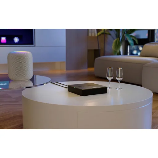 Egyszerű beállítás és elegáns kialakítás: A kompakt kialakításnak (88 × 88 × 20 mm) köszönhetően az eszköz bárhol könnyen elhelyezhető - az íróasztalon, a polcon vagy a router mellett. A működési állapotot egy finom LED-sáv jelzi, az USB-C port pedig gyors és stabil tápellátást biztosít.