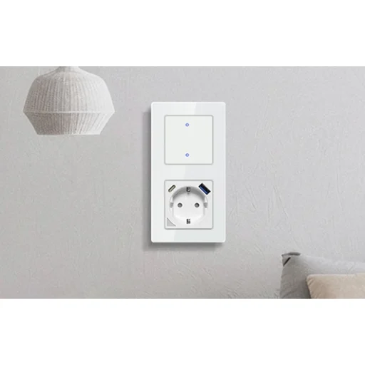 A fehér Avatto TS20 keret egy funkcionális befejező elem az intelligens elektromos berendezésekhez. 55x55 mm-es szabványos modulokat támogat, így könnyen alkalmazkodik a különböző alkatrészekhez – az érintőkapcsolóktól az USB-A és USB-C portokkal ellátott aljzatokig. A külső réteg edzett üvegből készült, karcálló, nem sárgul az idő múlásával, és rendkívül könnyen tisztán tartható.