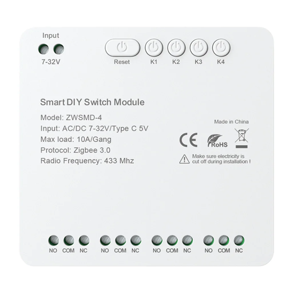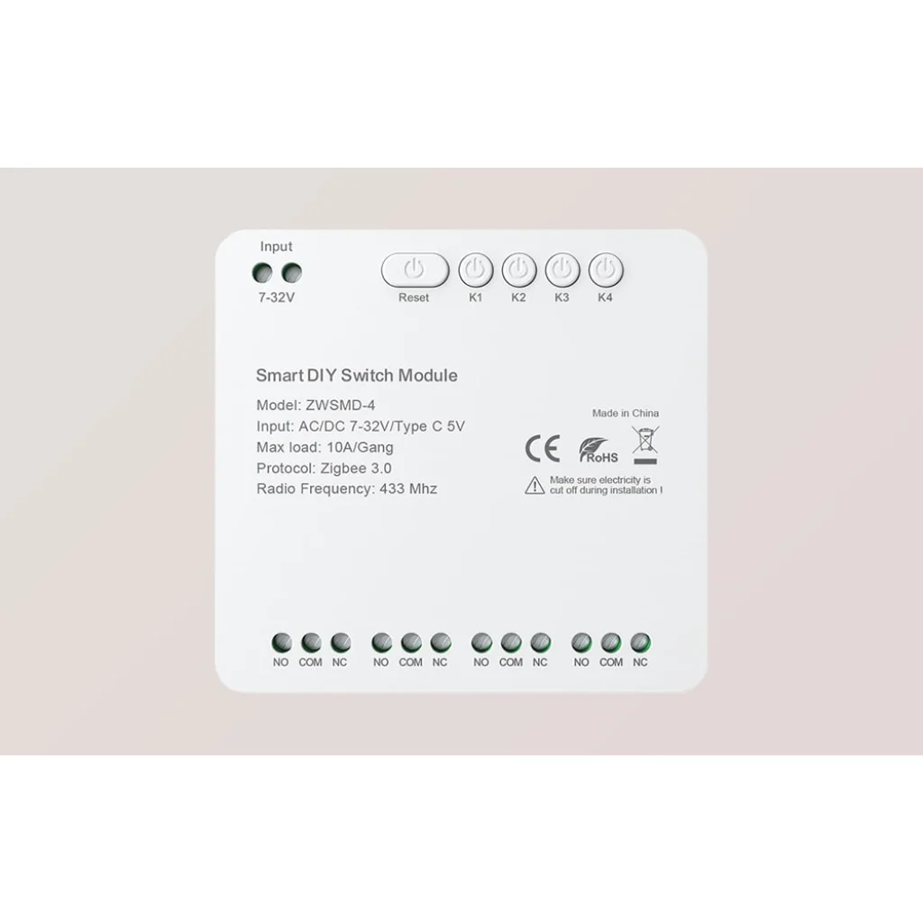 Az Avatto ZWSMMD-4-32V egy 4 csatornás ZigBee kapcsolómodul feszültségmentes érintkezővel, amelyet alacsony feszültségű eszközök biztonságos és pontos kezelésére terveztek, akár 32V DC feszültségig. Minden csatorna akár 10 A terhelést is támogat, ami nagy rugalmasságot biztosít a világítás, az otthoni automatizálás vagy a vezérlőrendszerek vezérlésében. A feszültségmentes érintkező használata ideálisvá teszi a modult ott, ahol a tápáramkör és a vezérlőjel szétválasztása szükséges.