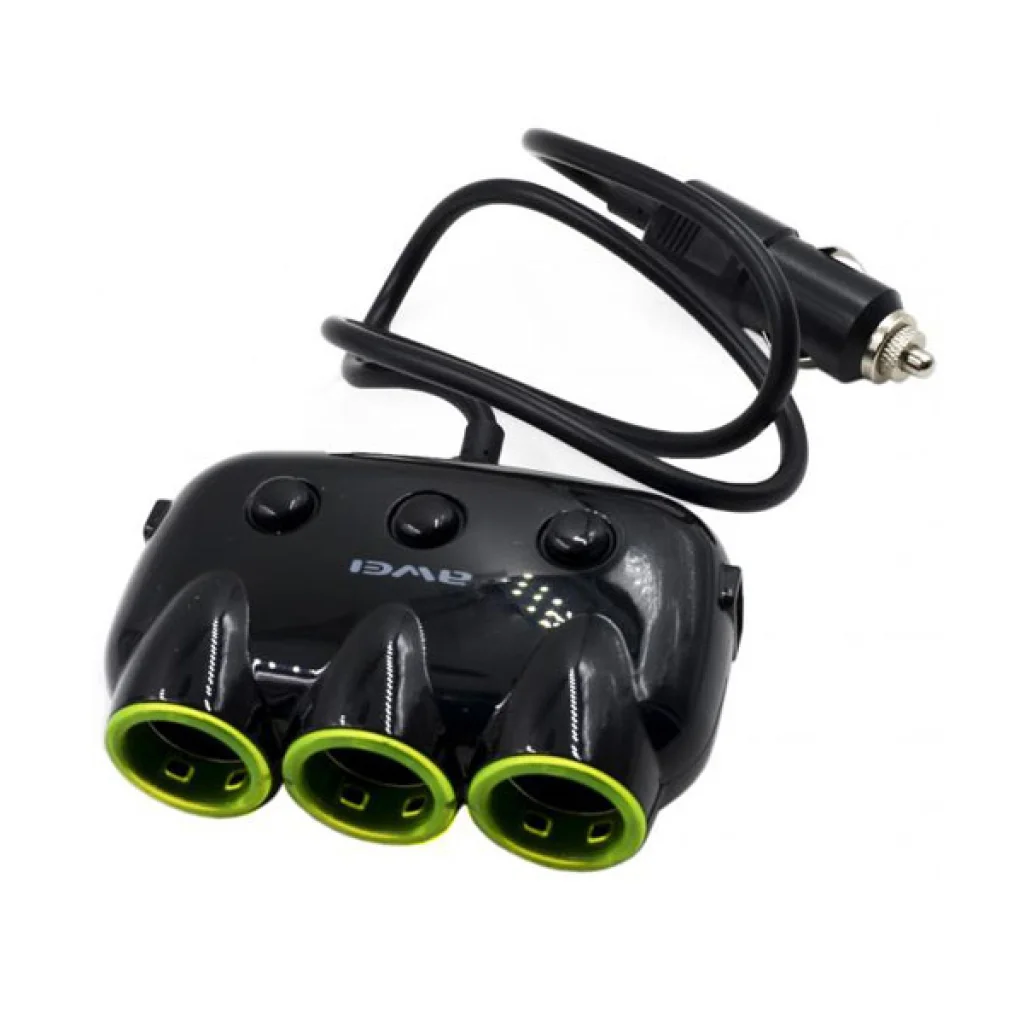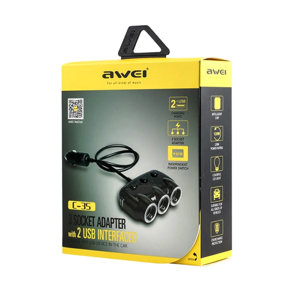 Awei C-35 szivargyújtó elosztó, mellyel 3 készüléket is használhatunk a 12V-os aljzatról. 2db USB port is megtalálható az elosztón.