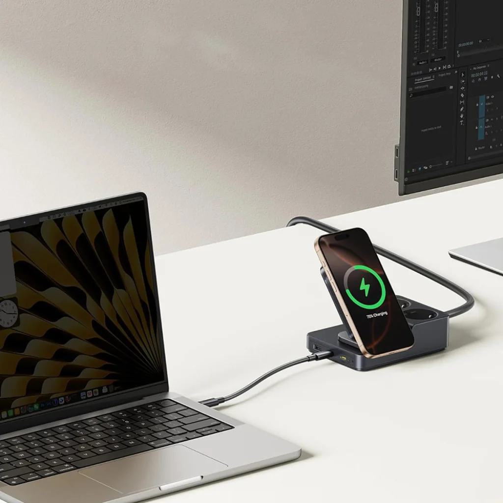A Baseus Nomos ND11 töltőállomás egy igazi 6 az 1-ben powerhouse, amely a modern élet kihívásaira szabott. Két szabványos AC aljzattal, két nagy teljesítményű USB-C porttal, egy USB-A porttal és egy integrált mágneses vezeték nélküli töltővel rendelkezik. Ez a sokoldalúság lehetővé teszi, hogy egyszerre akár hat eszközt is töltsön, legyen szó laptopról, okostelefonról, tabletről, okosóráról vagy egyéb perifériákról. Ideális otthoni, irodai vagy akár utazási használatra.