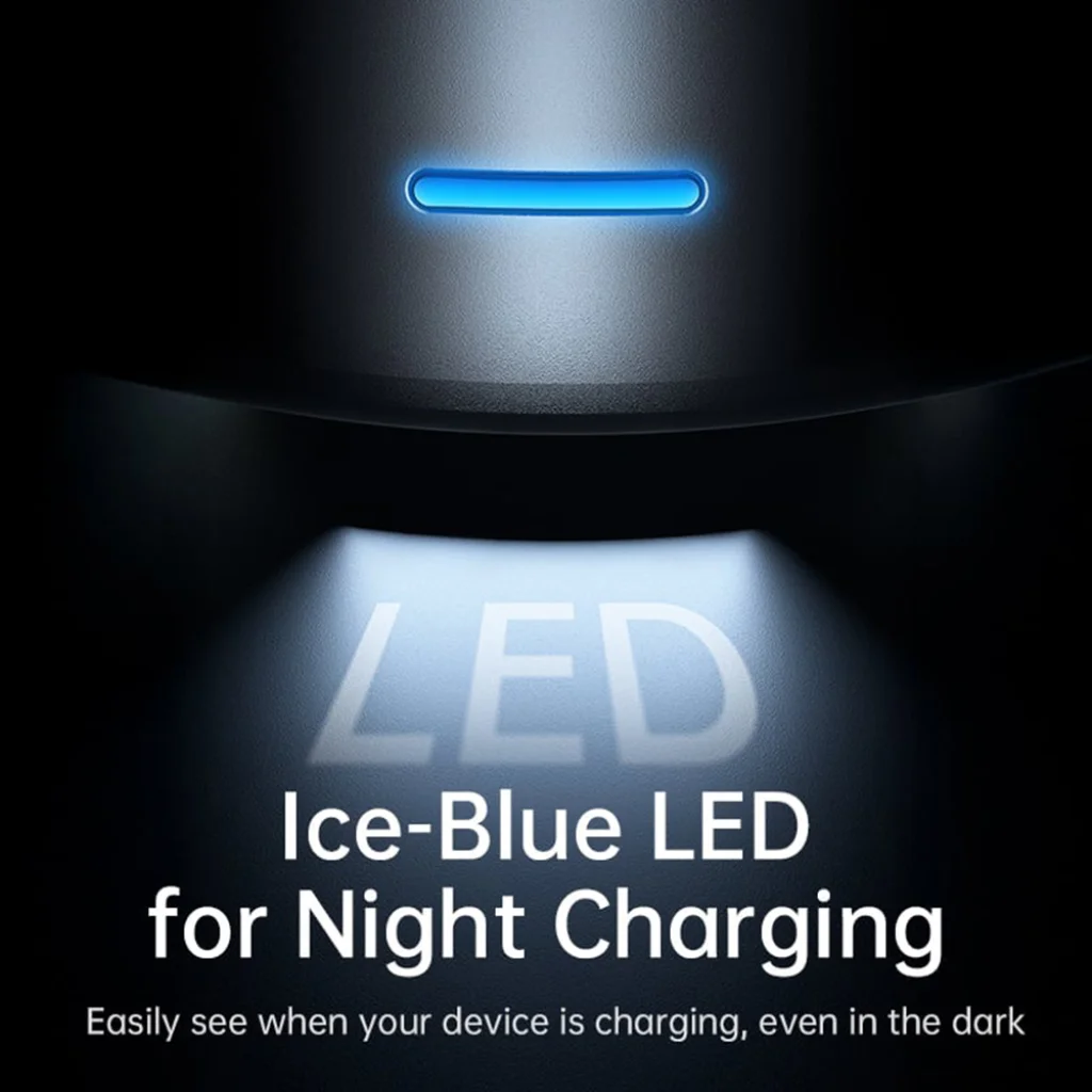 A beépített jégkék LED fény diszkréten jelzi, ha az eszköz töltés alatt áll, még sötétben is. Ez a praktikus funkció megkönnyíti a töltő észlelését és használatát az éjszakai utazások során.
