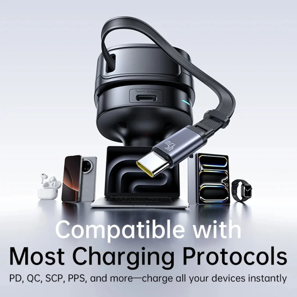 Mondjon búcsút a kusza kábeleknek! A Baseus PrimeTrip VR1 egy 80 cm hosszú, fokozatmentesen visszahúzható Type-C kábellel van felszerelve. Húzza ki a kábelt szükség szerint, majd a töltés befejeztével egyszerűen húzza vissza a rendezett tárolás és a rendetlenség elkerülése érdekében.