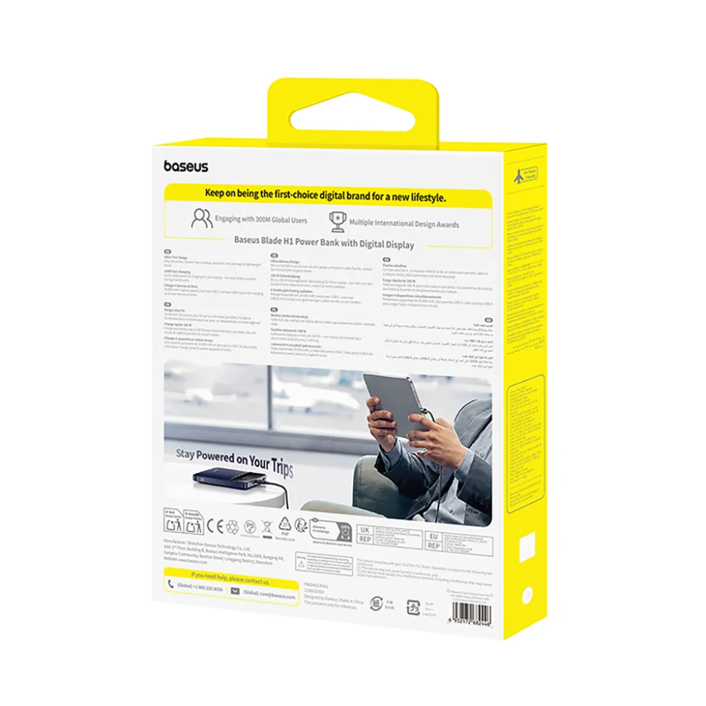 A Baseus Blade H1 egy új generációs powerbank – ultra-vékony, könnyű, és maximális hatékonyságra tervezett. Mindössze 17,8 mm vastag és 445 g súlyú, így könnyen elfér egy táskában vagy hátizsákban anélkül, hogy megterhelné annak tartalmát. 20,000 mAh kapacitása és akár 100W-os kimeneti teljesítménye lehetővé teszi, hogy gyorsan feltöltsön akár egy laptopot is, és egyidejűleg több eszközt is ellásson energiával. A beépített kijelző valós idejű információt nyújt a töltöttségi állapotról, a teljesítményről és a hátralévő üzemidőről. Az átmenő töltésnek köszönhetően egyidejűleg töltheted a powerbankot és a csatlakoztatott eszközöket is. A minimalista dizájn és a teljes funkcionalitás teszi a Blade H1-et ideális eszközzé igényes felhasználók számára, akár útközben, akár a mindennapokban.